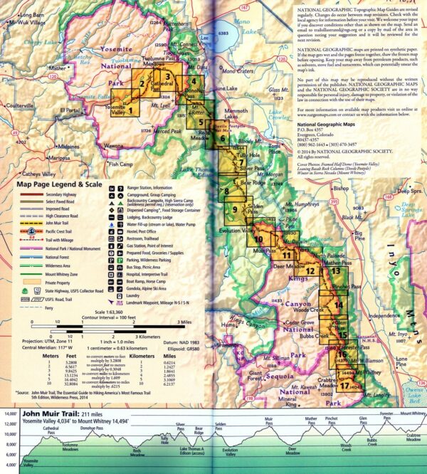 List of mapped locations: Whitney Portal, Symmes Creek, Onion Valley, Oak Creek, Taboose Creek, North and South Lakes, Vermilion, Bear Creek, Florence Lake, Pine Creek, Mono Pass, McGee Creek, Devils Postpile, Mammoth Lakes, Agnew Meadows, Silver Lake, Tuolomne Meadows, and finally the Yosemite Valley. GPS Compatible! - Complete UTM Grid.