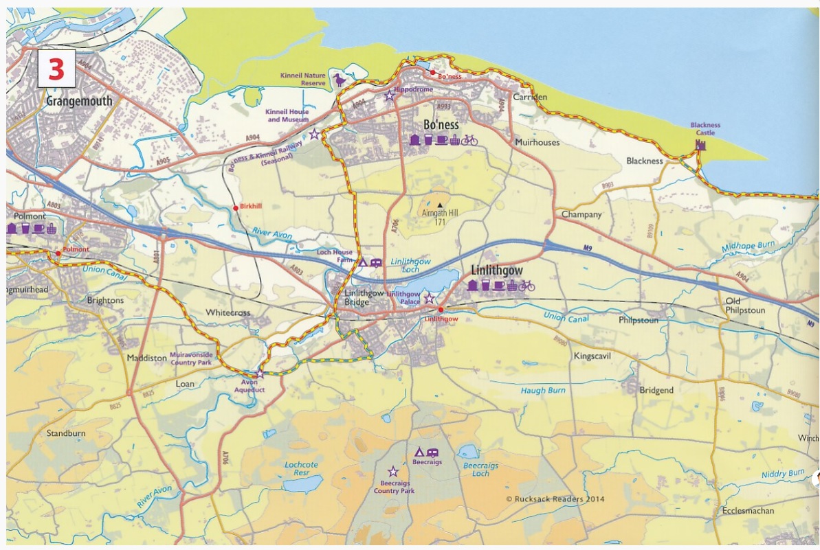 The John Muir Way runs for 134 miles (215 km) coast-to-coast across central Scotland, from Helensburgh on the Clyde to Dunbar on the North Sea. The route is as suitable for cyclists as for walkers, and it can be tackled as a coast-to-coast expedition or in sections - ten for walkers or five for cyclists. Its appeal ranges from the Rennie Mackintosh architecture of Helensburgh through the scenic grandeur of Loch Lomond, along two famous canals and past the amazing Falkirk Wheel, beside the Roman Antonine Wall, passing Linlithgow Palace, Blackness Castle and the Forth Bridges to the glories of Edinburgh. It finishes on the wide coastal expanses of East Lothian, at Dunbar with its ruined castle and John Muir's birthplace.