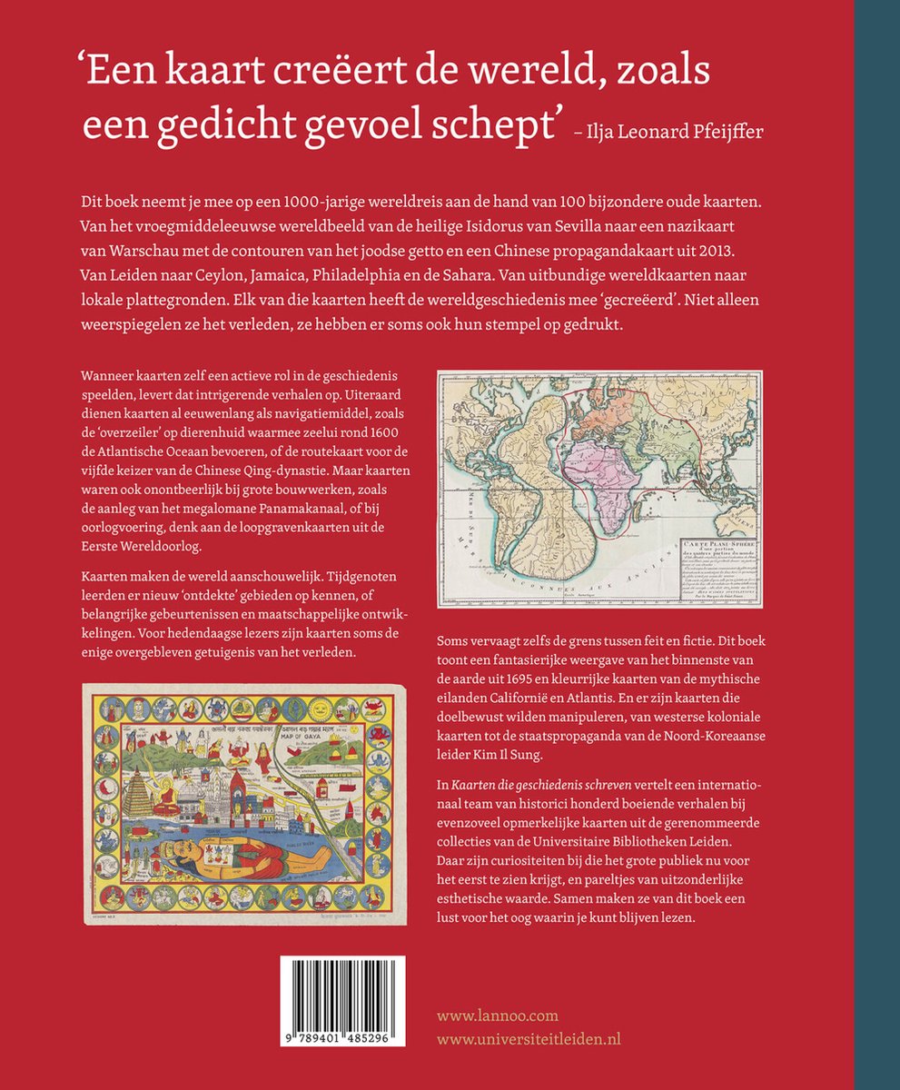 In Kaarten die geschiedenis schreven vertelt een internationaal team van historici honderd boeiende verhalen bij evenzoveel opmerkelijke kaarten uit de gerenommeerde collecties van de Universitaire Bibliotheken Leiden. Daar zijn curiositeiten bij die het grote publiek nu voor het eerst te zien krijgt, en pareltjes van uitzonderlijke esthetische waarde. Samen maken ze van dit boek een lust voor het oog waarin je kunt blijven lezen.