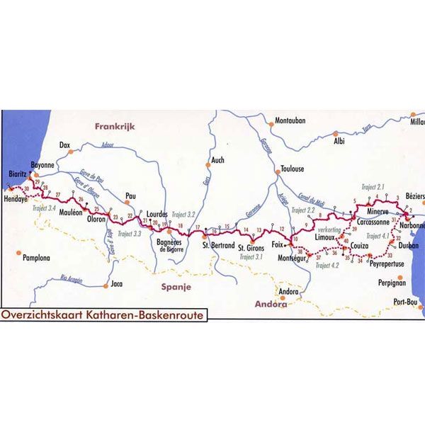 Deze gids beschrijft een fietsroute van 600 kilometer van Narbonne naar Biarritz. De route verbindt de Middellandse Zee met de Atlantische Oceaan en sluit aan op de FIS-routes ´De Groene weg naar de Middellandse Zee´, ´Langs oude Wegen en pelgrimssteden´ en de ´St. Jacobs fietsroute´.De route voert langs de historische plekken die een grote rol hebben gespeeld in de opkomst, maar vooral in de ondergang van de Katharen.