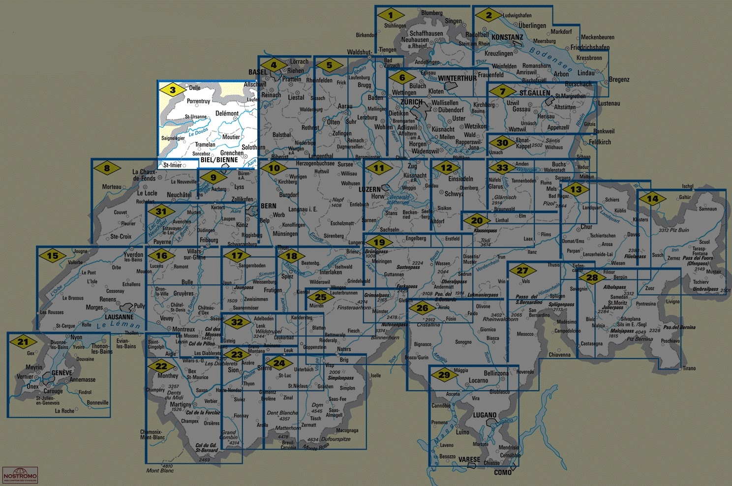 Nauwkeurig gemaakte wandelkaarten (scheur- en watervast), met een heldere en overzichtelijke cartografie. Schaal 1:60.000. Met vele routes (rood ingetekend), waarvan de verschillende moeilijkheidsgraden duidelijk te onderscheiden zijn. Verder aangegeven: berghutten, bushaltes en campings. Bovendien met een coördinatenstelsel voor GPS gebruik. In de praktijk zijn dit uitstekende kaarten voor het plannen van bergtochten en voor het maken van wandelingen over makkelijke en goed gemarkeerde paden. Voor het maken van moeilijker bergwandelingen zijn de kaarten van het Bundesamt (zie elders in deze webwinkel) beter geschikt. Titel maakt deel uit van ons assortiment Wandelkaarten Zwitserland.