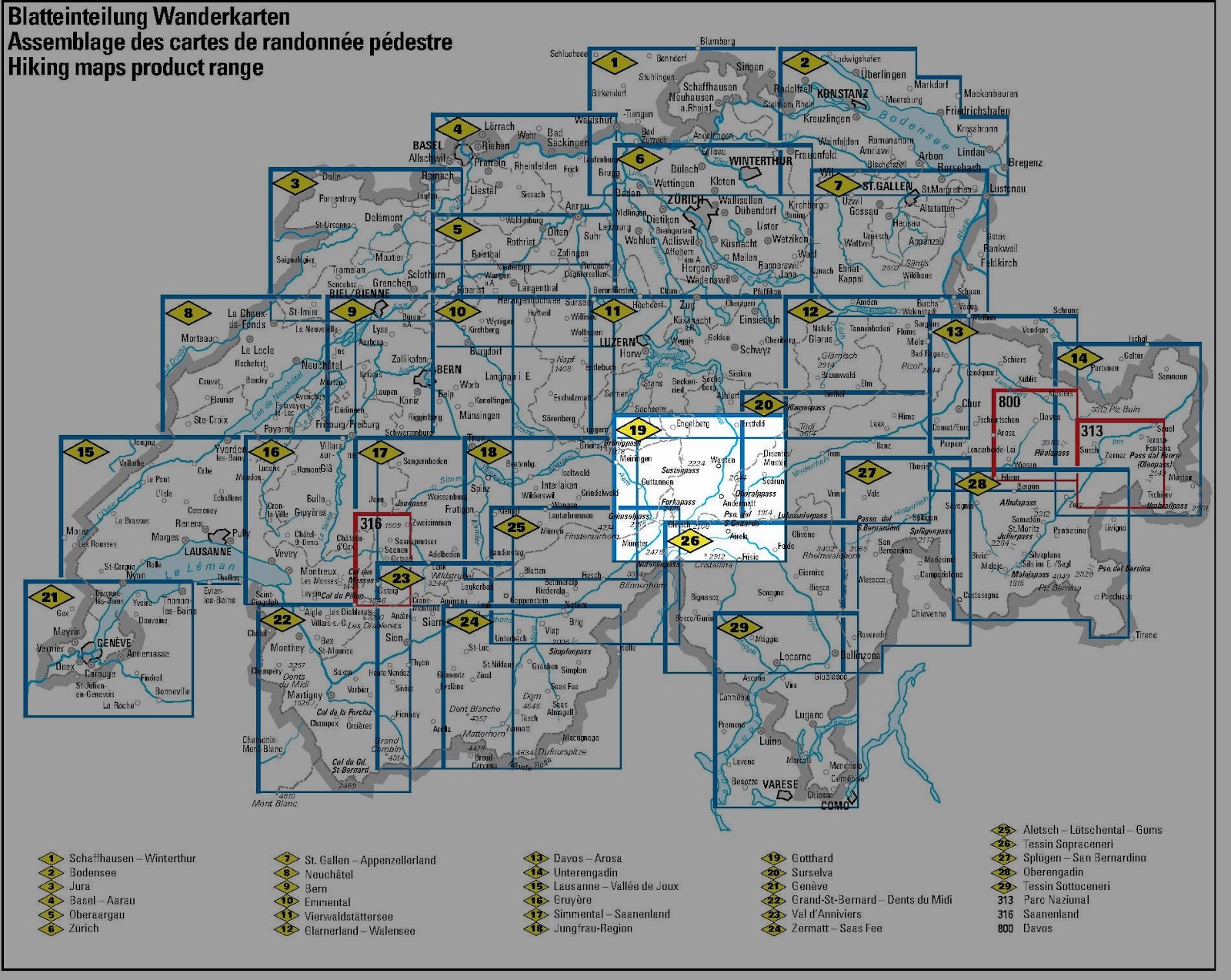 Kaarten en gidsen > Wandelen > Wandelkaarten > Europa > Zwitserland en Oostenrijk (en Alpen als geheel) > Zwitserland > Tessin, Ticino > KFW-19 Gotthard, Grimsel | wandelkaart / overzichtskaart