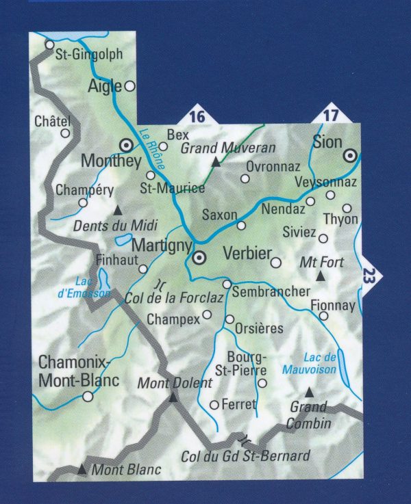 Kaarten en gidsen > Wandelen > Wandelkaarten > Europa > Zwitserland en Oostenrijk (en Alpen als geheel) > Zwitserland > Wallis > Unterwallis > KFW-22 Grand-St.Bernard/ Dents du Midi | wandelkaart / overzichtskaart