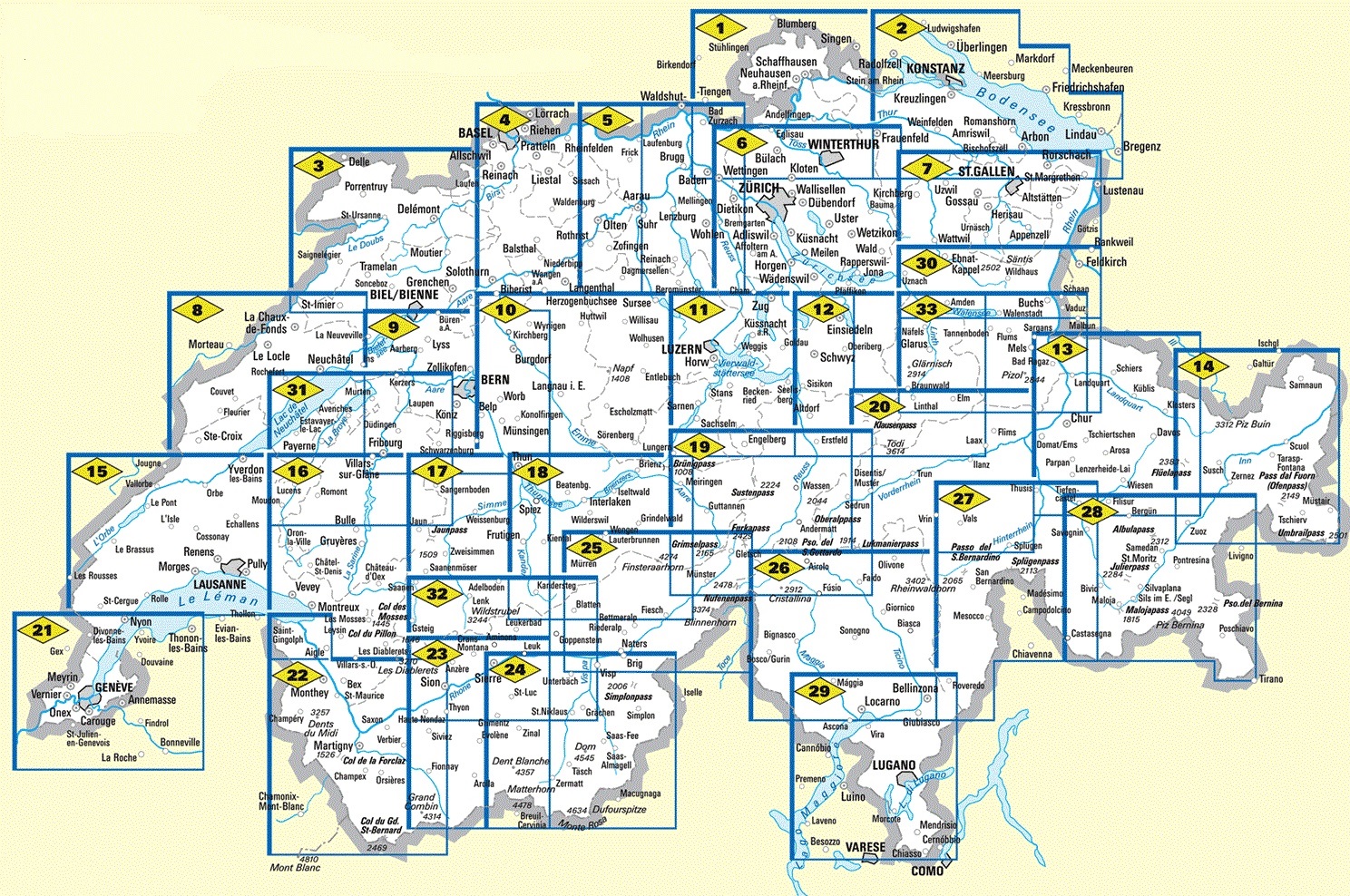 Nauwkeurig gemaakte wandelkaarten (scheur- en watervast), met een heldere en overzichtelijke cartografie. Schaal 1:60.000. Met vele routes (rood ingetekend), waarvan de verschillende moeilijkheidsgraden duidelijk te onderscheiden zijn. Verder aangegeven: berghutten, bushaltes en campings. Bovendien met een coördinatenstelsel voor GPS gebruik. In de praktijk zijn dit uitstekende kaarten voor het plannen van bergtochten en voor het maken van wandelingen over makkelijke en goed gemarkeerde paden. Voor het maken van moeilijker bergwandelingen zijn de kaarten van het Bundesamt (zie elders in deze webwinkel) beter geschikt. Titel maakt deel uit van ons assortiment Wandelkaarten Zwitserland.