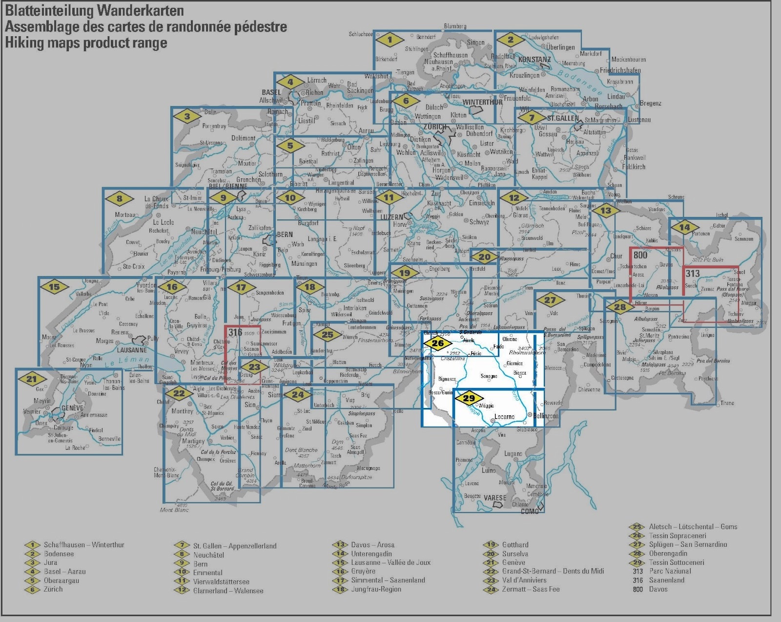 Nauwkeurig gemaakte wandelkaarten (scheur- en watervast), met een heldere en overzichtelijke cartografie. Schaal 1:60.000. Met vele routes (rood ingetekend), waarvan de verschillende moeilijkheidsgraden duidelijk te onderscheiden zijn. Verder aangegeven: berghutten, bushaltes en campings. Bovendien met een coördinatenstelsel voor GPS gebruik. In de praktijk zijn dit uitstekende kaarten voor het plannen van bergtochten en voor het maken van wandelingen over makkelijke en goed gemarkeerde paden. Voor het maken van moeilijker bergwandelingen zijn de kaarten van het Bundesamt (zie elders in deze webwinkel) beter geschikt. Titel maakt deel uit van ons assortiment Wandelkaarten Zwitserland.
