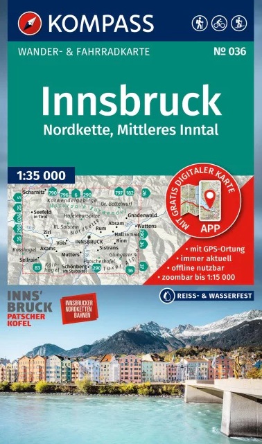 Kaarten en gidsen > Wandelen > Wandelkaarten > Europa > Zwitserland en Oostenrijk (en Alpen als geheel) > Oostenrijk > Tirol > Kompass wandelkaart KP-036 Innsbruck und Umgebung