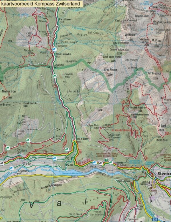 Wandelkaart (tevens ski- en/of fietsroutes - zie cover), gedrukt op scheur- en watervast materiaal. Wandelingen in rood ingetekend. In berggebieden worden de moeilijkheidsgraden van de routes zichtbaar gemaakt aan de hand van verschillen in de routelijnen. Reliëfaanduiding d.m.v. hoogtelijnen. Met symbolen voor campings, parkeerterreinen, berghutten, uitzichtpunten en overige toeristische informatie. Inbegrepen is een QR-code waarmee u wordt geleid naar de digitale kaart (zoombaar) van dit gebied. Sommige kaarten gaan vergezeld van een boekje waarin een aantal extra gedetailleerde kaarten van dit gebied zijn opgenomen, plus enige toeristische streekinformatie (Duitstalig).