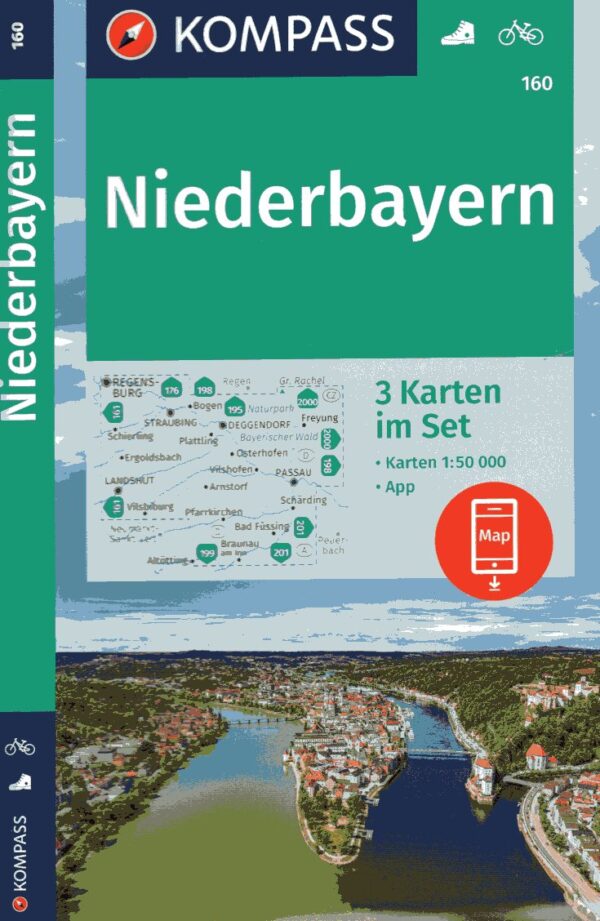 Set wandelkaarten (tevens fietsroutes en waar van toepassing ook ruiter-, ski- en langlaufroutes). Wandelingen in rood ingetekend, fietsroutes in groen. Reliëfaanduiding d.m.v. hoogtelijnen. Met symbolen voor campings, parkeerterreinen, uitzichtpunten en overige toeristische informatie. | Ein weites Land – von Passau bis Regensburg, vom weltbekannten Wallfahrtsort Altötting bis zu den stillen Ausläufern des Bayerischen Waldes. Freundliche Dörfer zwischen sanften Hügeln und ausgedehnte Wiesen, freundliche Menschen und die sprichwörtliche bayerische Gastfreundlichkeit. Und all das auf einer Wander- und Radkarte? - KOMPASS machts möglich, und zwar in einem Set mit drei Blättern im Maßstab 1:50000 – ideal, um ganz Niederbayern zu durchstreifen! Die KOMPASS Wanderkarten überzeugen durch ? eine GPS-genaue und aktuelle Karte zur einfachen Orientierung ? lesefreundliche Optik im idealen Maßstab von 1:25.000/1:35.000 oder 1:50.000 Die GPS-genauen KOMPASS Karten sind ideal für...weiterlesen