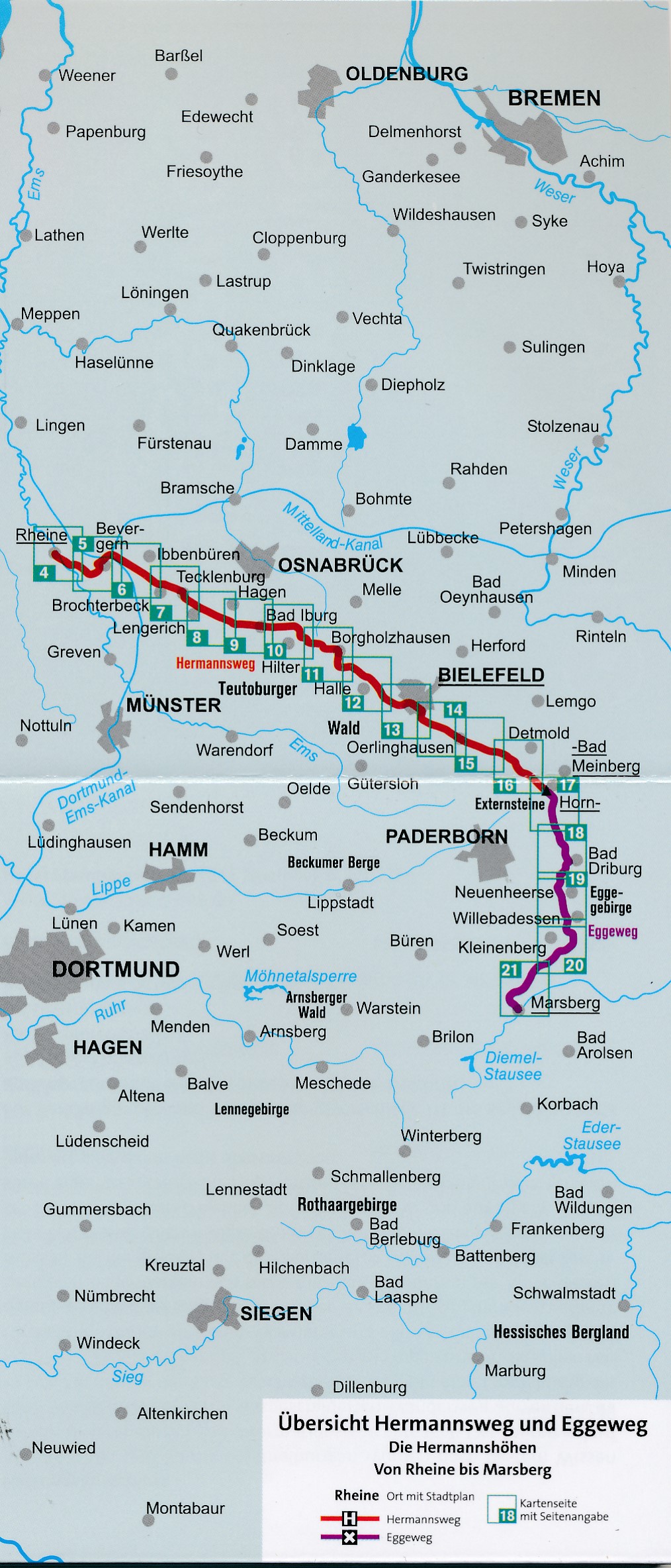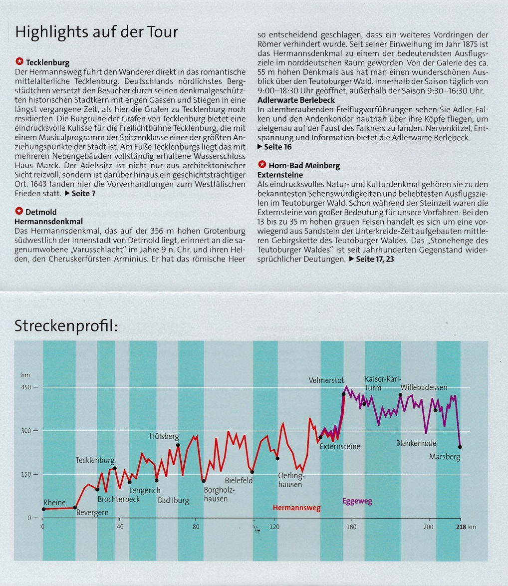 - Zwei Naturparks liegen am Weg: Terra Vita und der Naturpark Eggegebirge/Südlicher Teutoburger Wald; zahlreiche Schutzhütten; Markierung ist das schwarze „H" auf weißem Grund.
