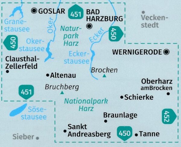 Het grootste nationale park van Duitsland met een oppervlakte van 24700 ha in de deelstaten Niedersachsen en Sachsen-Anhalt beslaat een oppervlakte van 24700 ha en herbergt talloze natuurfenomenen: heidevelden en bergbeekjes, vreemd gevormde granieten kliffen en als hoogtepunt de 1141 m hoge Brocken, de hoogste top in Noord-Duitsland. Deze nieuwe tweezijdig bedrukete kaart is de ideale begeleider voor alle tochten en activiteiten in het hart van het Harz National Park. Op een ideale schaal van 1:25000 presenteert het niet alleen alle routes, maar ook de gehele toeristische infrastructuur van de regio - inclusief het openbaar vervoer. De 3in1 wandelkaart is nu nog duidelijker en beter leesbaar. De 'Active Guide' informeert u over buitenactiviteiten en de gratis app voor onderweg is ook beschikbaar. Dit vormt de perfecte basis voor het plannen van een wandeltocht. De precieze cartografie (met hoogtelijnen) toont alle beloopbare wandelroutes (en fietsroutes) inclusief classificatie en moeilijkheidsgraad. Informatie zoals, horeca, campings en nog veel meer is ook opgenomen op de kaart. Het papier is scheur- en weerbestendig.