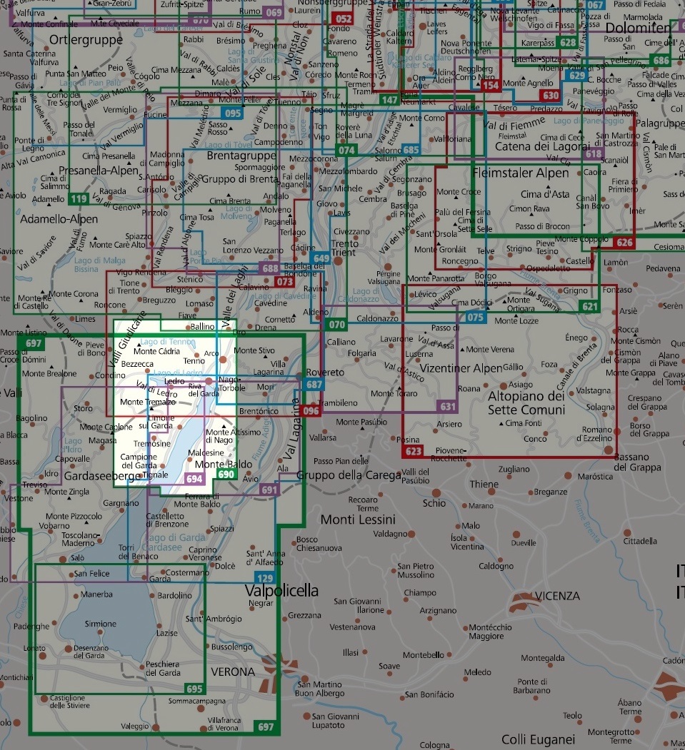 Gedetailleerde wandelkaarten (met vaak ook fietsroutes en langlaufroutes, zie cover). Wandelingen in rood ingetekend en met versch. symbolen voor div. moeilijkheidsgraden en andere prakt. info. Klik op geografisch overzicht voor de bladindeling. Titel maakt deel uit van ons assortiment Wandelkaarten Dolomieten / Zuid-Tirol. Deze kaart heeft een grid voor GPS-gebruik.