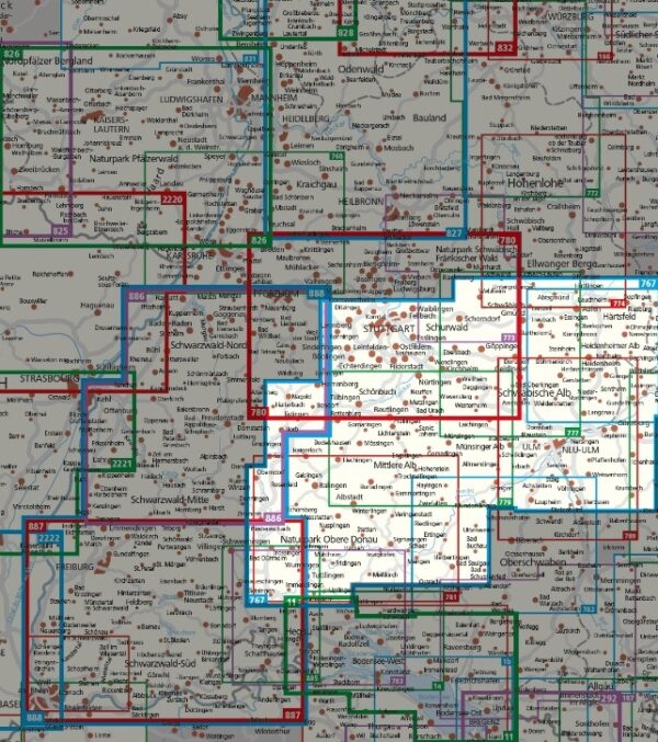Set van 4 wandelkaarten van de Schwäbische Alb, een middelgebergte in de deelstaat Baden-Württemberg ten oosten van het Zwarte Woud. De kaart omvat van Stuttgart en de Neckarvlakte in het noorden tot Ulm en het Donau-dal in het zuiden. Nauwkeurige kaarten op 1:50 000 tonen de paden, hun type en hun identificatie. Met de kaart verkrijgt u tevens de toegang tot een link waarmee u de digitale kaart van dit gebied kunt downloaden en op uw smartphone kunt zetten.