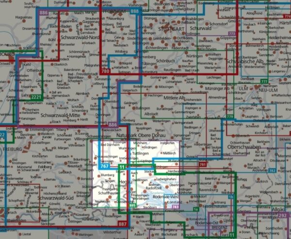 Kaart van het westelijke deel van de Bodensee rond Hegau, Schaffhausen, Bodensee en tot Villingen-Schwenningen in het noorden. Omvat ook het eiland Mainau. Nauwkeurige kaarten op 1:50 000 tonen de paden, hun type en hun identificatie. Met symbolen voor campings, parkeerterreinen, uitzichtpunten en overige toeristische informatie. Inbegrepen is een QR-code waarmee u wordt geleid naar de digitale kaart (zoombaar) van dit gebied. Sommige kaarten gaan vergezeld van een boekje met wat toeristische streekinformatie (Duitstalig).