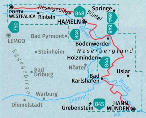 Kaarten en gidsen > Wandelen > Wandeltochten > Meerdaagse wandelroutes > Europa > Duitsland > Noordwest-Duitsland (met Harz) > Bremen, Ems, Weser, Hannover & overig Niedersachsen > Kompass wandelkaart KP-819 Weserbergland-Weg