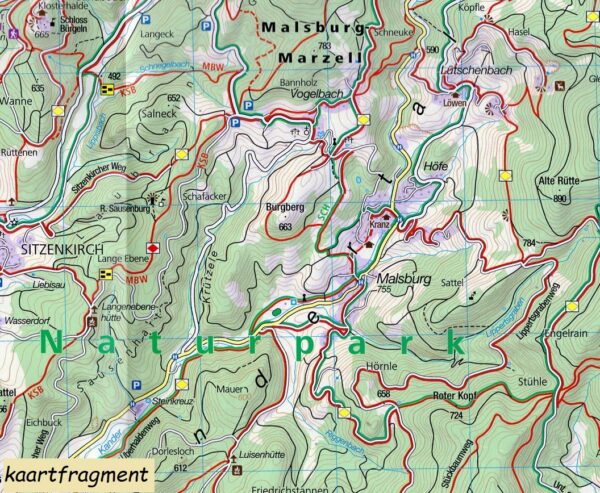 Gedetailleerde wandelkaart. Wandelingen in rood ingetekend (met verschillende symbolen voor diverse moeilijkheidsgraden bij routes in berggebieden) en andere praktische info. De laatste jaren maken de Kompasskaarten een kwalitatieve inhaalslag door. Was de cartografie vroeger van matige kwaliteit, tegenwoordig benadert deze steeds meer de kwaliteit van topografische kaarten. Praktisch alle kaarten gaan vergezeld van een boekje met wat toeristische info en wandeltips.