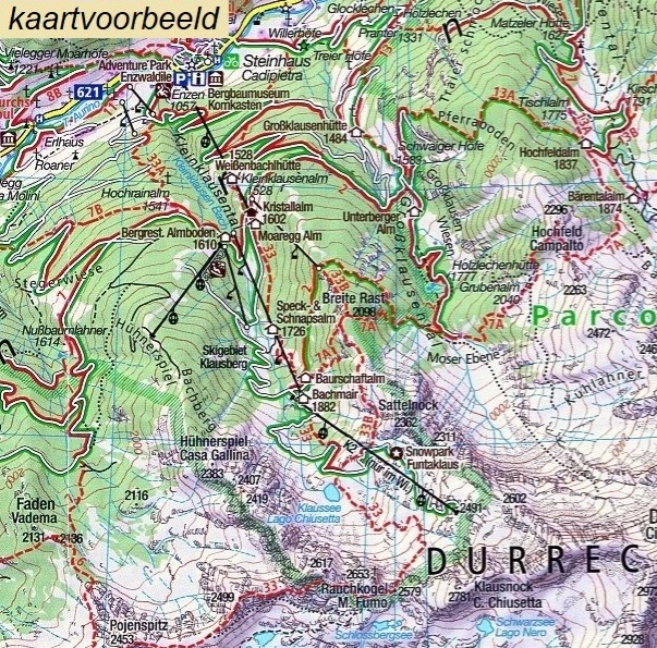 Goede wandelkaart (tevens fietsroutes). Wandelingen in rood ingetekend en met verschillende symbolen voor diverse moeilijkheidsgraden en andere praktische info. Deze kaart heeft een grid voor GPS-gebruik.