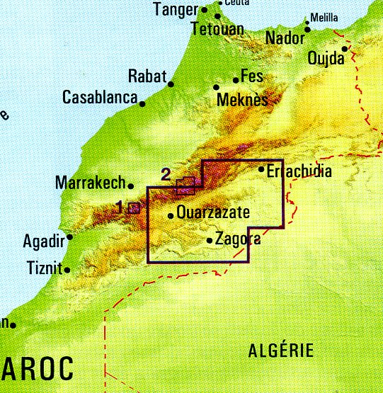 Een van de meer gedetailleerde wegenkaarten die er van deze regio bestaan. Het bestrijkt een groot gebied aan de zuid-oost kant van de Hoge Atlas, langs de route van de 'Duizend Kasbahs' (vestingplaatsen).