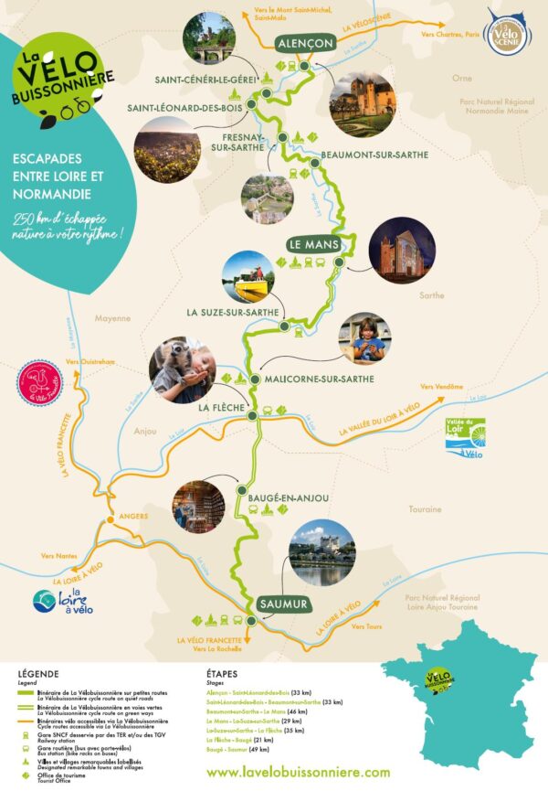 - Van Alençon naar Saumur voert de Vélobuissonnière 240 km door de natuur, van de Orne naar de Maine-et-Loire en door een groot deel van de Sarthe. De route loopt door zeven steden en dorpen en twee regionale natuurparken. Er zijn vier etappes met een totale lengte van 550 km.