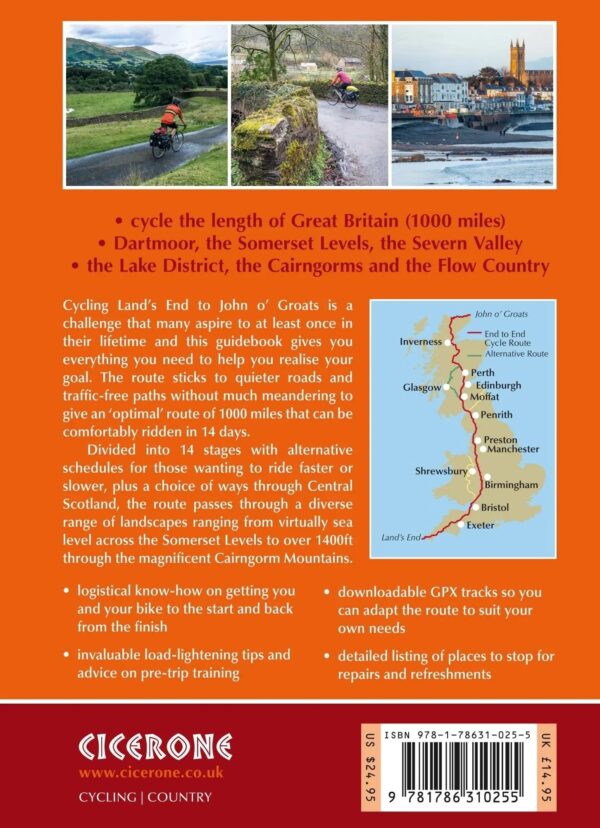 Handy guidebook describing a 14-day End to End cycle route from Land's End to John o' Groats (LEJOG), largely on minor roads and cycle paths, with detailed maps, profiles, all key grid refs and GPX files. Also full listings of accommodation providers, tourist information offices and bike shops as well as tips for first-time cycle tourers.