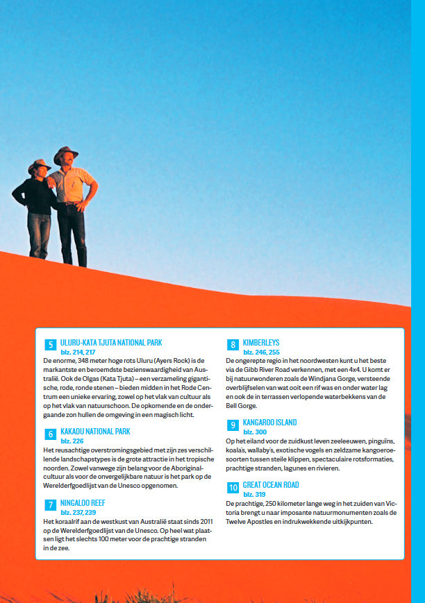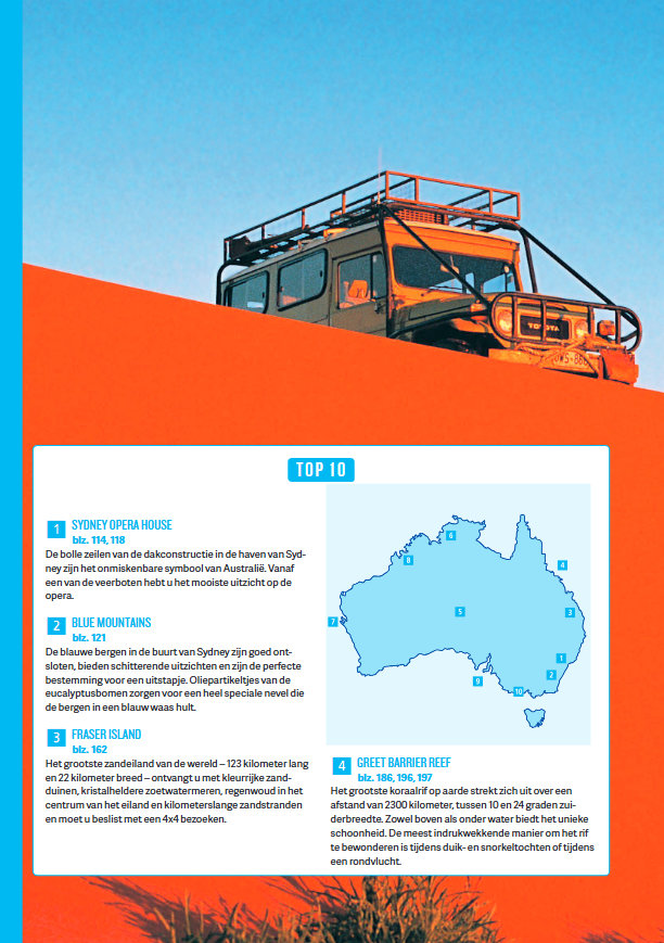 De uitgestrektheid en de ongereptheid van Australië en de ongedwongen stijl van de Aussies fascineren vele bezoekers. Het Great Barrier reef, de prachtige kusten, de wonderlijke fauna en flora en de onmetelijke 'outback' worden afgewisseld met boeiende metropolen zoals Sydney, Melbourne, Brisbane en Perth.