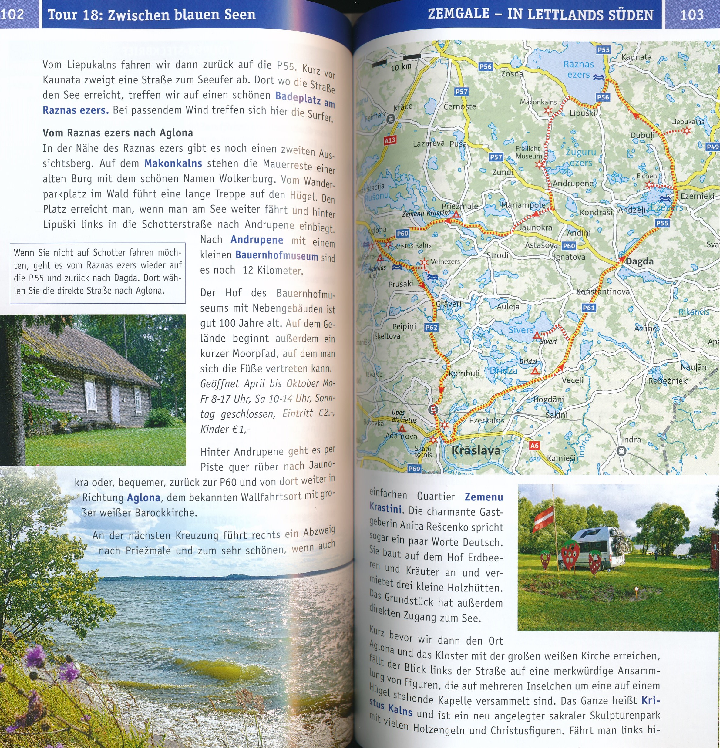 Kilometerlange, fast menschenleere Sandstrände säumen die Küste Lettlands. Im Landesinneren bieten Hochmoore, alte Wälder, naturbelassene Flüsse und unzählige Seen reizvolle Ziele für Naturfreunde, Paddler und Wanderer. In den Naturparks weiden halbwilde Pferde und Auerochsen und wer gerne angelt, findet in Lettland ein Paradies. Die quirlige Hauptstadt Riga mit alten Jugendstilbauten und einer stimmungsvollen Altstadt und das nahe Seebad Jurmala bilden das kulturelle Zentrum des Landes und für Reisende einen attraktiven Kontrast. 32 Wander- und Entdeckertouren für aktiven Urlaub: Die Tourenauswahl reicht vom Spaziergang zubesonderen Plätzen in der Natur oder dem Besuch der alten Ordensburgen über Wanderungen durchs Moor, am Fluss oder am Meer bis zur ein- oder mehrtägigen Kanutour mit Biwak am Flussufer. | Alle wichtigen Sehenswürdigkeiten + die schönsten Badeplätze + Campingführer und Übernachtungstipps.