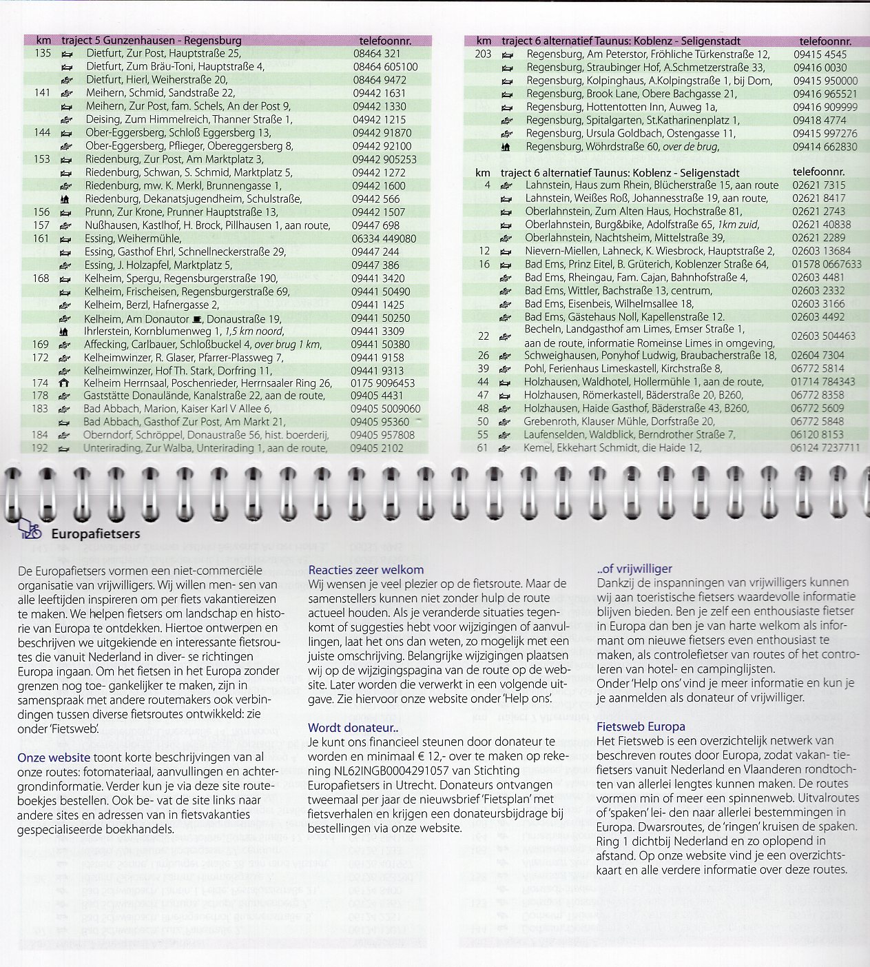 Katwijk - Regensburg. In het begin van onze jaartelling bestuurden de Romeinen een formidabel wereldrijk, waarvan de noordgrens - de Limes - zich uitstrekte vanaf de Noordzee bij Katwijk, langs Rijn en Donau tot aan de Zwarte Zee. Resten van de Limes en de bijbehorende verdedigingswerken zijn op veel plaatsen nog tastbaar aanwezig. Dit eerste deel volgt de sporen tot Regensburg aan de Donau, met een uitloop naar Passau aan de Oostenrijkse grens. Het thema leent zich goed voor een fietstrektocht. De Limes Fietsroute biedt de (vakantie)trekker een gids om op aantrekkelijke en informatieve wijze een groot deel van Europa te doorkruisen. Overwegend is gekozen voor kleine wegen en vrije fietspaden door rivierdalen. Het hoogste punt meet 500 meter, met slechts enkele hellingen. Het alternatief door het Taunusgebergte biedt de liefhebber heuvels. De route is geschikt om met kinderen te fietsen. Routegids in spiraalband. Handzaam formaat en praktisch in gebruik. Duidelijke en gedetailleerde kaarten, heldere routebeschrijvingen, wetenswaardigheden en praktische (verblijfs)info kenmerken deze veelgeprezen reeks fietsgidsen voor lange-afstandsfietsers.