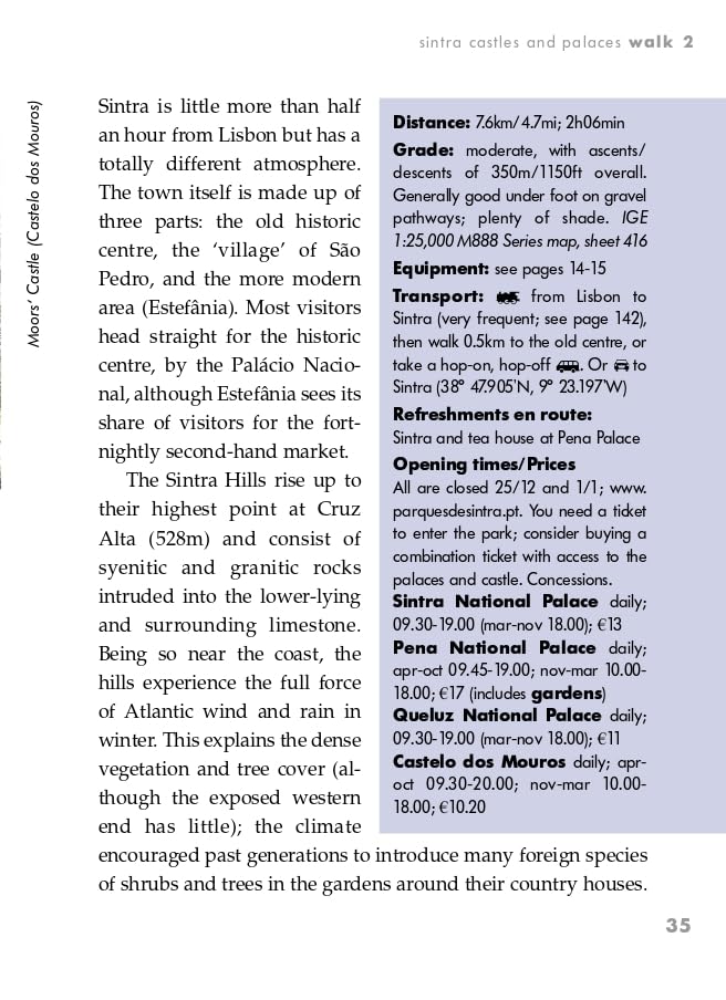 Area covered: The book describes one walk in the city centre, five in the Sintra-Cascais Natural Park and other walks further afield but easily reached by public transport. There are two excursions -- one to the Tagus Estuary Natural Park, the other to the medieval walled town of Óbidos.