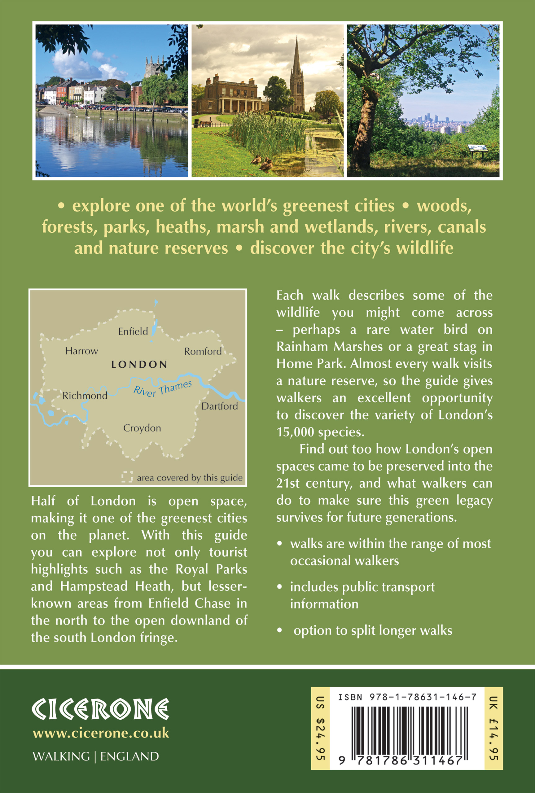 woods and forests, parks and heaths, London's rivers - far more than just the Thames - and canals. Many of the walks pass by some of London's architectural jewels, while others delve so deep into countryside that it's difficult to believe you are still in London.