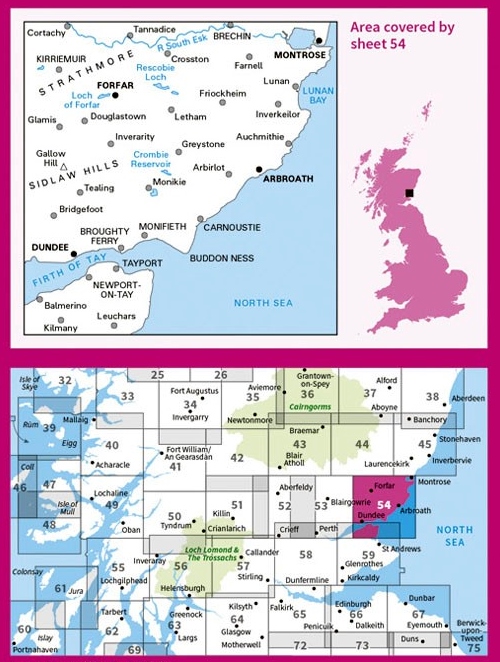 Kaarten en gidsen > Wandelen > Wandelkaarten > Europa > Britse Eilanden > Groot-Brittannië > Schotland > de Schotse Hooglanden (ten noorden van Glasgow / Edinburgh) > LR-054 Dundee and Montrose, Forfar and Arbroath | topografische wandelkaart