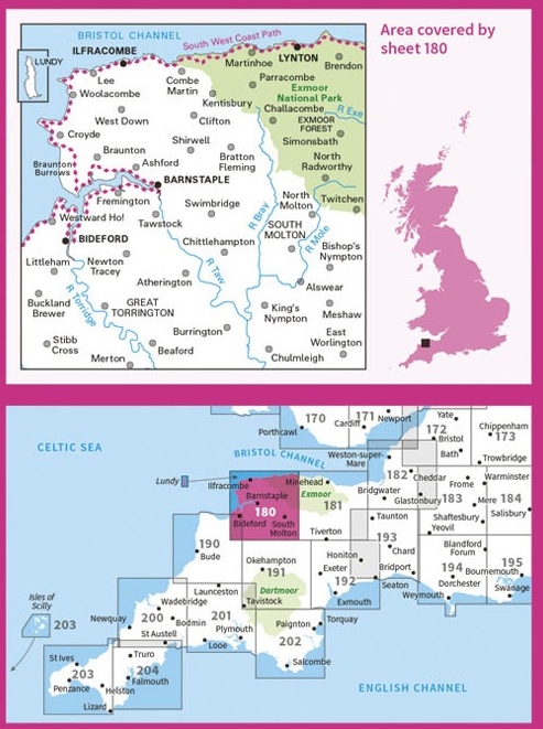 Kaarten en gidsen > Wandelen > Wandelkaarten > Europa > Britse Eilanden > Groot-Brittannië > Engeland > West Country > LR-180 Barnstaple + Ilfracombe | topografische wandelkaart