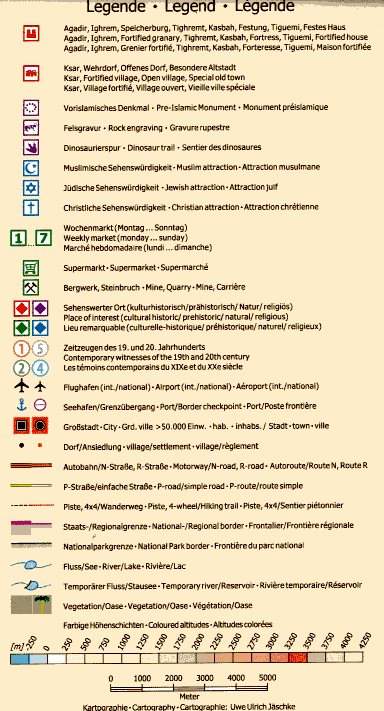De toeristische kaarten geven het reliëf aan en iedereen die Marokko wil beleven, heeft met deze kaarten een schat aan informatie. Wandelpaden, paden en verharde wegen zijn gemakkelijk te onderscheiden. Tijdelijke rivierlopen (wadi's) worden getoond ter oriëntatie in het terrein. De kaart heeft een duidelijke legenda. Op de kaart staan ook bezienswaardigheden aangegeven, deze worden onderscheiden met kenmerken en worden op de achterzijde toegelicht. Er wordt onderscheid gemaakt tussen de categorieën architectuur, prehistorie, natuur + leven (inclusief geologie) en religie. Daarnaast staat er (ook op de achterkant) meestal een representatieve kleurenfoto en achtergrondinformatie over de geschiedenis, bezienswaardigheden en andere bijzonderheden.