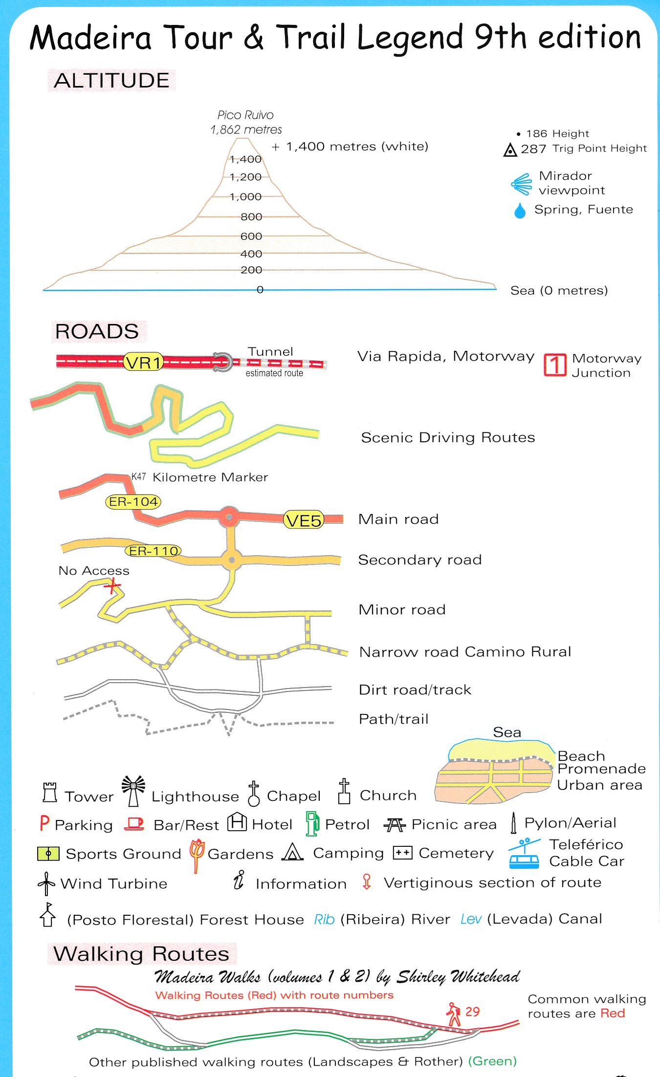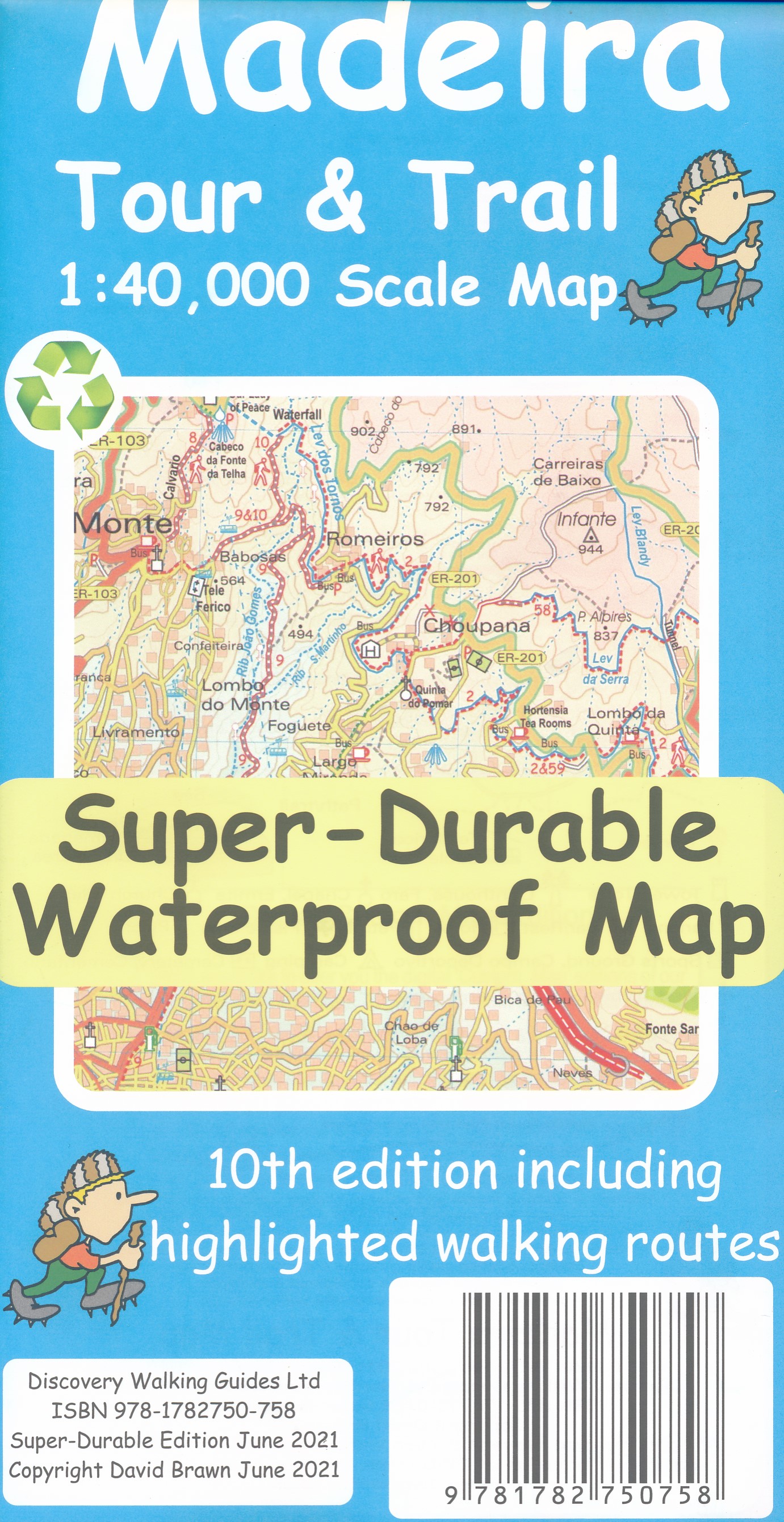 Gedetailleerde wandelkaart met routes, hoogtelijnen en toeristische info; gedrukt op kunststof (scheur- en watervast). | This most detailed map of Madeira includes our 'Tour & Trail' level of detail ranging from major roads to secondary roads to minor roads to streets and camino rural narrow country roads, plus dirt roads and walking trails. Altitude background colouring is designed to clearly show the altitude range when travelling across the island by car or on foot. 100 metre and 50 metre contours are clearly shown on the map along with a large number of individual height points and all of the official 'Trig' points. Tour & Trail attention to detail is legendary as is our useful symbol range including miradors, picnic areas, petrol stations, bar/restaurants and parking areas where you can pull off the road safely. You will easily identify springs, caves, sports grounds, cemetries, churchs, chapels, lighthouses, towers and forts, camping areas, wind turbines, hotels etc. For adventurers on foot Tour & Trail Maps are researched and designed by hikers for use by hikers. Our comprehensive gps ground surveys produce the best mapping available but the value of this on the ground research becomes even more important when you leave the tarmac. All of our DWG walking routes are accurately gps surveyed giving you confidence in the accuracy of our Tour & Trail Maps.
