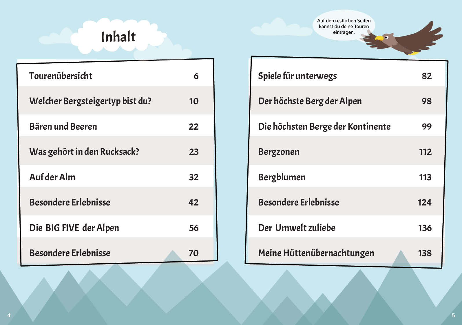 Das liebevoll gestaltete Tourenbuch überzeugt mit vielen Extraseiten rund um das Thema Berge und Alpen. Es ist handlich und robust, passt in jeden Rucksack und ist somit der perfekte Begleiter für unterwegs. Wartezeiten aufs Essen oder Hüttenabende können damit unterhaltsam überbrückt werden. Entdeckerkarten für spannende Suchspiele auf den Wanderungen und Erfolgssticker stehen zusätzlich zum Download zur Verfügung.
