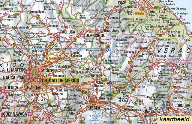 Deel uit een serie overzichts-/ wegenkaarten, met een mooie en betrouwbare cartografie. Aanduiding van plaatsen, wegen, reliëf d.m.v. schaduwing, nationale parken en symbolen voor toeristische bezienswaardigheden. Plattegronden van de hoofdplaatsen. Dubbelzijdig bedrukt, dus gering volume en gewicht. Geen plaatsnamenregister. Met een speciale kaart van: Around Ciudad de México 1 : 1.000.000. Plattegrond: Ciudad de México 1 : 30.000.
