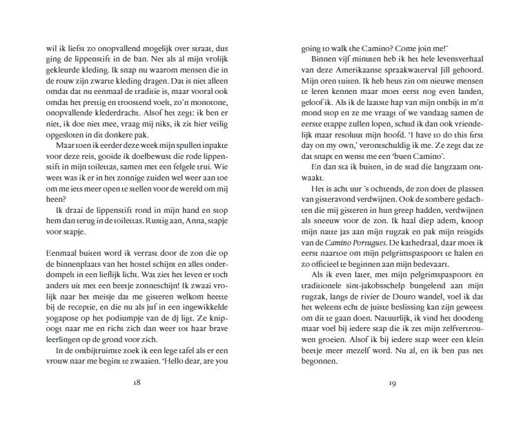 De Camino naar Santiago de Compostella: een wandeltocht met een ongekende aantrekkingskracht. Dat ervaart ook Anna Visser. Wanneer na het plotselinge overlijden van haar partner het leven alle kleur heeft verloren, besluit ze haar rugzak te pakken en te gaan lopen. Tijdens haar reis ontdekt Anna de magie van deze pelgrimsroute, die haar stap voor stap haar levenslust teruggeeft. De tocht verandert haar leven zo sterk dat ze bij thuiskomst een ingrijpende beslissing neemt: ze laat alles achter zich en begint een volledig nieuw bestaan als herbergier aan de Camino del Norte, in een klein dorpje in Spanje. Daar ontvangt ze elke dag nieuwe pelgrims met bijzondere verhalen. In dit boek neemt Anna je mee op haar reis van verlies en verdriet naar het vinden van een nieuw leven en nieuw geluk.