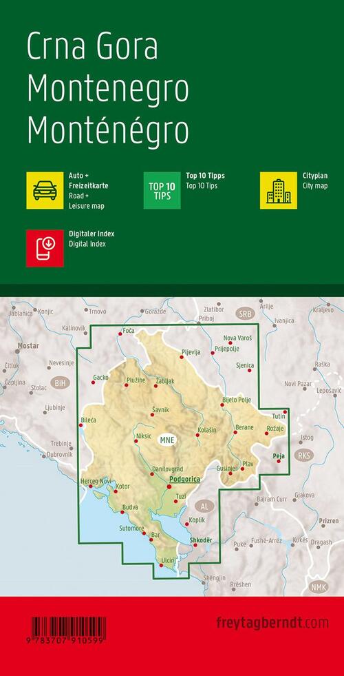 De routekaart "Montenegro 1:150.000" bevat naast een overzichtelijke indeling ook talrijke aanvullende informatie zoals wegomstandigheden, bezienswaardigheden, campings en een stadsplattegrond. De uitgebreide index van plaatsen maakt ook een snelle oriëntatie mogelijk.De "Top 10 Tips" serie biedt een kleine aanvulling waarin de tien belangrijkste bezienswaardigheden kort en bondig in meerdere talen worden beschreven. (Talen: Montenegrijns, Duits, Engels, Frans, Engels, Italiaans, Spaans) Details: Top 10 Tips bezienswaardigheden, stadsplattegrond Podgorica, stadsindex met postcodes.