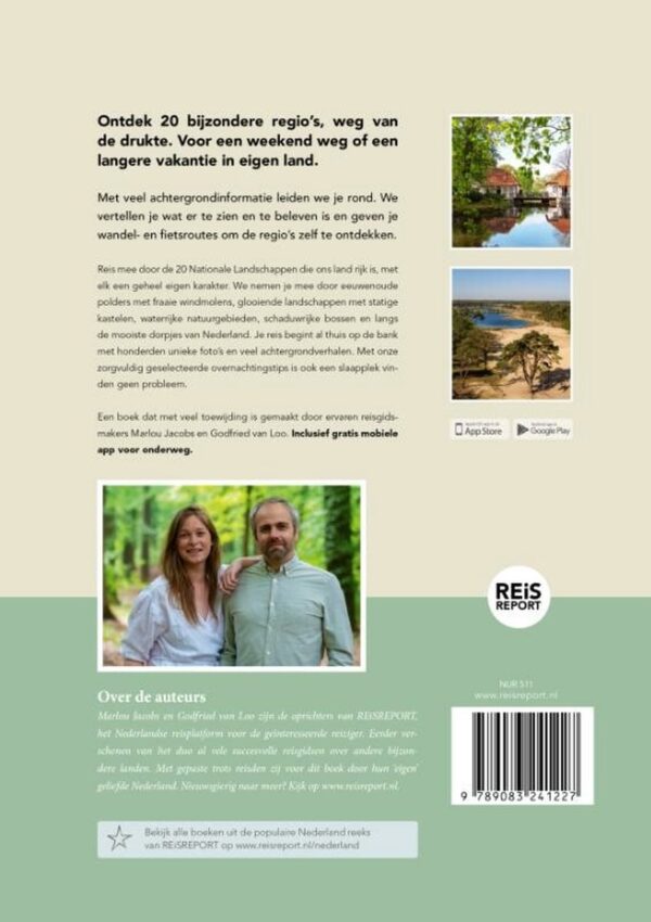 Reis mee door de 20 Nationale Landschappen die ons land rijk is, met elk een geheel eigen karakter. We helpen je bovendien ook praktisch op weg om deze landschappen zelf te ontdekken met tientallen fiets- en wandelroutes, kaarten, zorgvuldig geselecteerde overnachtingstips en veel achtergrondinformatie. Op een verrassende manier leer je Nederland zo nog beter kennen. Een boek geschreven door de ervaren reisgidsmakers van REiSREPORT, Marlou Jacobs en Godfried van Loo.