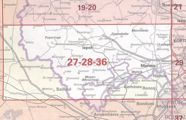 Kaarten en gidsen > Wandelen > Wandelkaarten > Europa > Benelux > België & Luxemburg > Vlaanderen & Brussel > Gent, Brugge & westelijk Vlaanderen > NGI-27-28-36 Ieper (topografische kaart 1:50.000)
