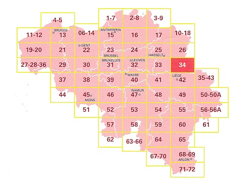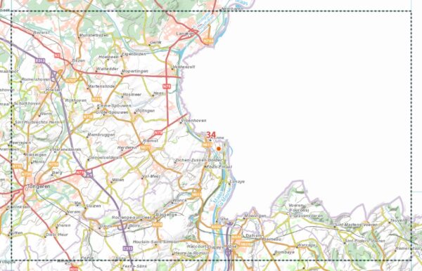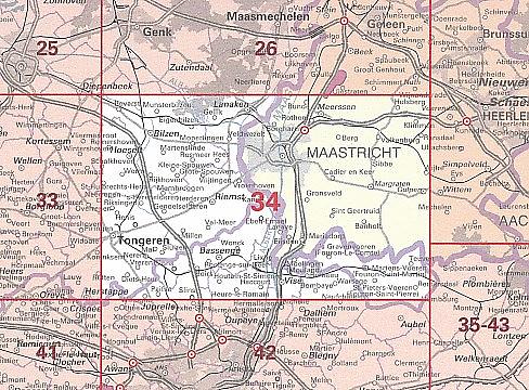 Topografische kaart met heldere cartografie. Veel detaillering, tot en met vele onverharde paden (m.u.v. de smalste), boerderijengroepen, etc. Verder met hoogtelijnen, grondgebruik, coördinatenstelsel (GPS!). Geen fiets- of wandelroutes aangegeven. | Deze kaart (34 Tongeren) kan worden gebruikt door 'Santiago-lopers' die niet de Via Mosana willen lopen. Komende vanaf het Pieterpad of het Jacobspad gaan zij namelijk bij Maastricht 'rechtsaf' en lopen m.b.v. deze kaart naar Tongeren, al waar men de Via Limburgica kan oppakken. Die brengt je tot Rocroi (F).