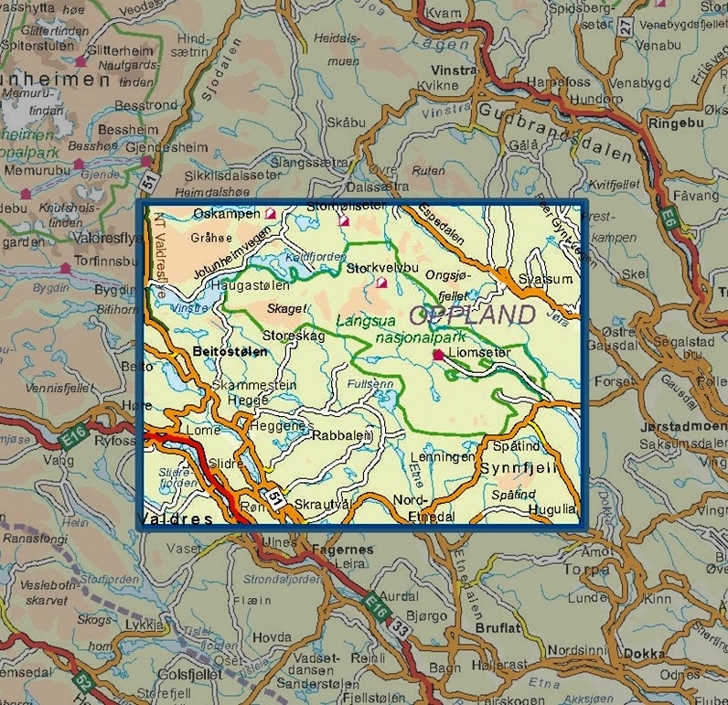 NO-3002 Langsua is een gedetailleerde, scheur- en watervaste kaart die meer dan 3000 km2 (64 x 47 km) bestrijkt. Op deze kaart vindt u gemakkelijk de wandelroutes en ook de accommodaties in de omgeving. Deze kaart perfect als wandelt of van hut naar hut trekt, bijvoorbeeld naar de top van Skaget of een dagwandeling naar het oosten op Valdresfly. Ook bedoeld voor de wintersport (skitouren en langlaufen).