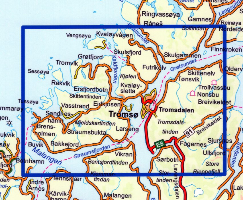 Kaarten en gidsen > Wandelen > Wandelkaarten > Europa > Scandinavië (& Noordpool) > Noorwegen > Noors Lapland > NO-3010 Tromsø- Kvaløya | topografische wandelkaart 1:50.000