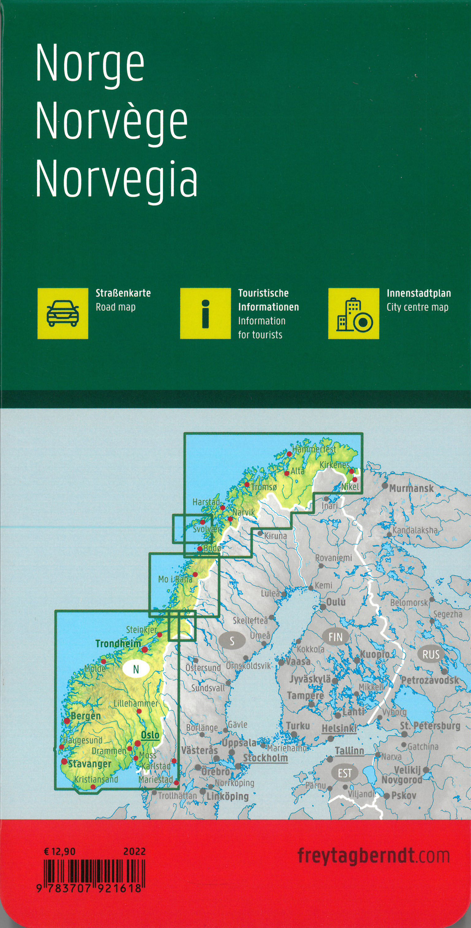 Naast de overzichtelijke cartografie bevat deze kaart van Noorwegen een schat aan aanvullende informatie zoals de toestand van de wegen, bezienswaardigheden, campings en diverse plattegronden van het stadscentrum. De uitgebreide index van plaatsen maakt ook een snelle oriëntatie mogelijk. Stadsplattegronden van Bergen, Hammerfest, Oslo, Narvik, Stavanger en Trondheim;Stadsindex met postcodes, afstanden in km