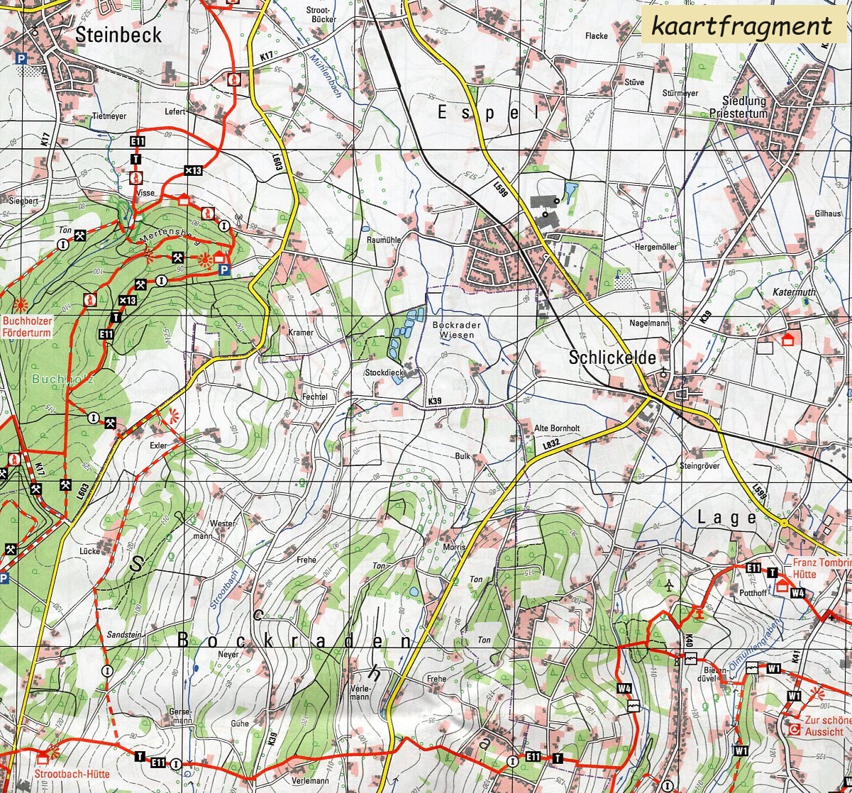 Gedetailleerde topografische wandelkaart, vele routes ingetekend. | Das Tecklenburger Land, in dem die wichtigsten Orte durch den 136 km langen Tecklenburger-Land-Rundweg (weißes "t" auf schwarzem Grund) verbunden werden, liegt im Kreis Steinfurt und grenzt im Norden und Osten an das Nachbarland Niedersachsen an. Sein nördlicher Bereich wird geprägt durch den Verlauf des Mittellandkanals. Nördlich des Kanals liegen die Orte Hörstel, Hopsten und Recke, nach Süden schließen sich nördlich des Teutoburger Waldes Mettingen und Ibbenbüren an. Neben dem Tecklenburger-Land-Rundweg und mehreren vom Westfälischen Heimatbund betreuten Fernwanderwegen durchquert hier der insgesamt 2.500 km lange Europäische Wanderweg E11 (Niederlande-Masuren) das norddeutsche Flachland. Im Tecklenburger Land verläuft er weitgehend parallel zum vom Wiehengebirgsverband betreuten Töddenweg. Die Bergbaustadt Ibbenbüren, mit 51.000 Einwohnern die größte Stadt im Tecklenburger Land, stellt das nördliche Portal zum Teutoburger Wald dar und ist über einen eigenen Zugangsweg unmittelbar mit den Hermannshöhen verbunden. Die landschaftliche Vielfalt macht die Region ganzjährig zu einer attraktiven Wanderwelt.