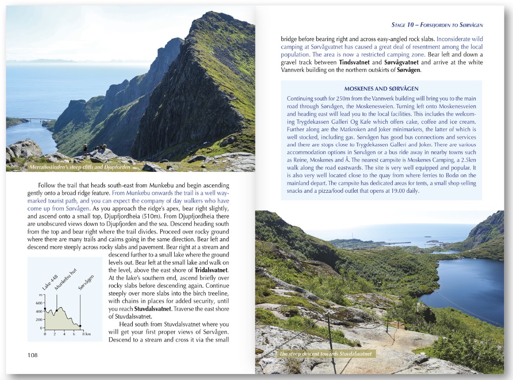 Each of the five multi-day hikes (the Lofoten Long Crossing, the Mountains of Narvik, the Mountains of Ofotfjorden, the Troms Border Trail and Finnmarksvidda) are described in detail, with accommodation, facilities and transport options highlighted, and alternative itineraries listed where relevant. Some of the trails criss-cross over the border into neighbouring Sweden and Finland.