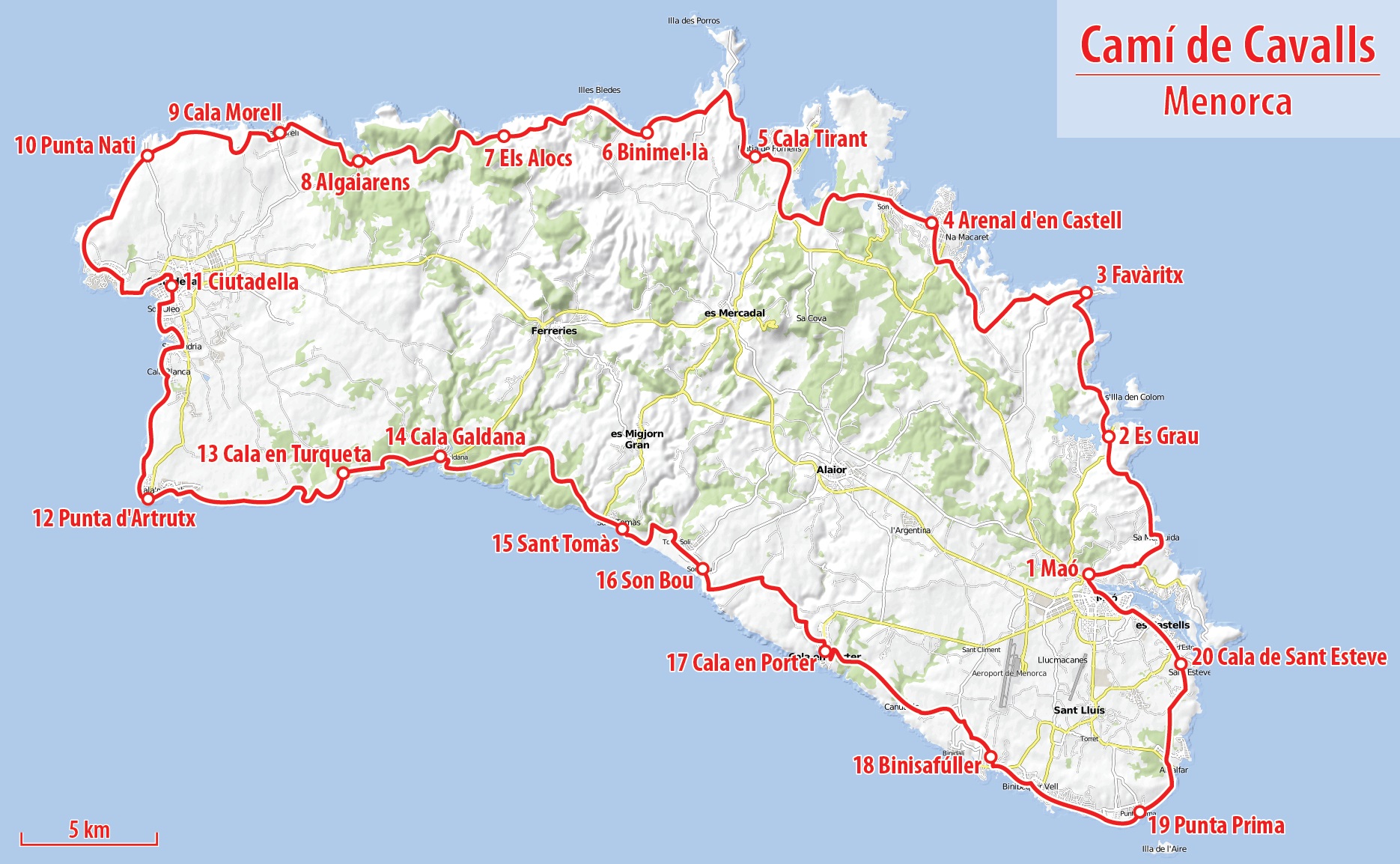De Camí de Cavalls, genoemd naar de vroegere bereden patrouilles, omcirkelt het Balearische eiland sinds de late middeleeuwen. In 2010 kreeg het pad de toeristische onderscheiding van opname in het netwerk van Europese langeafstandswandelpaden als GR223 doorlopende kustwandelroute. Sindsdien genieten zowel toeristen als plaatselijke bewoners te voet, te paard of op de fiets van het 185 km lange pad of delen ervan, om te genieten van de gevarieerde kustlijn van Menorca - of het nu gaat om afgelegen rotsachtige baaien, beboste kloven, door de wind belichte rotsplateaus of mooie strandmeren en duinenrijen met zandstranden. Het pad ontsluit de mooiste hoekjes en vele bezienswaardigheden van het eiland - soms op doorgangen die kort geleden nog voor wandelaars gesloten waren.