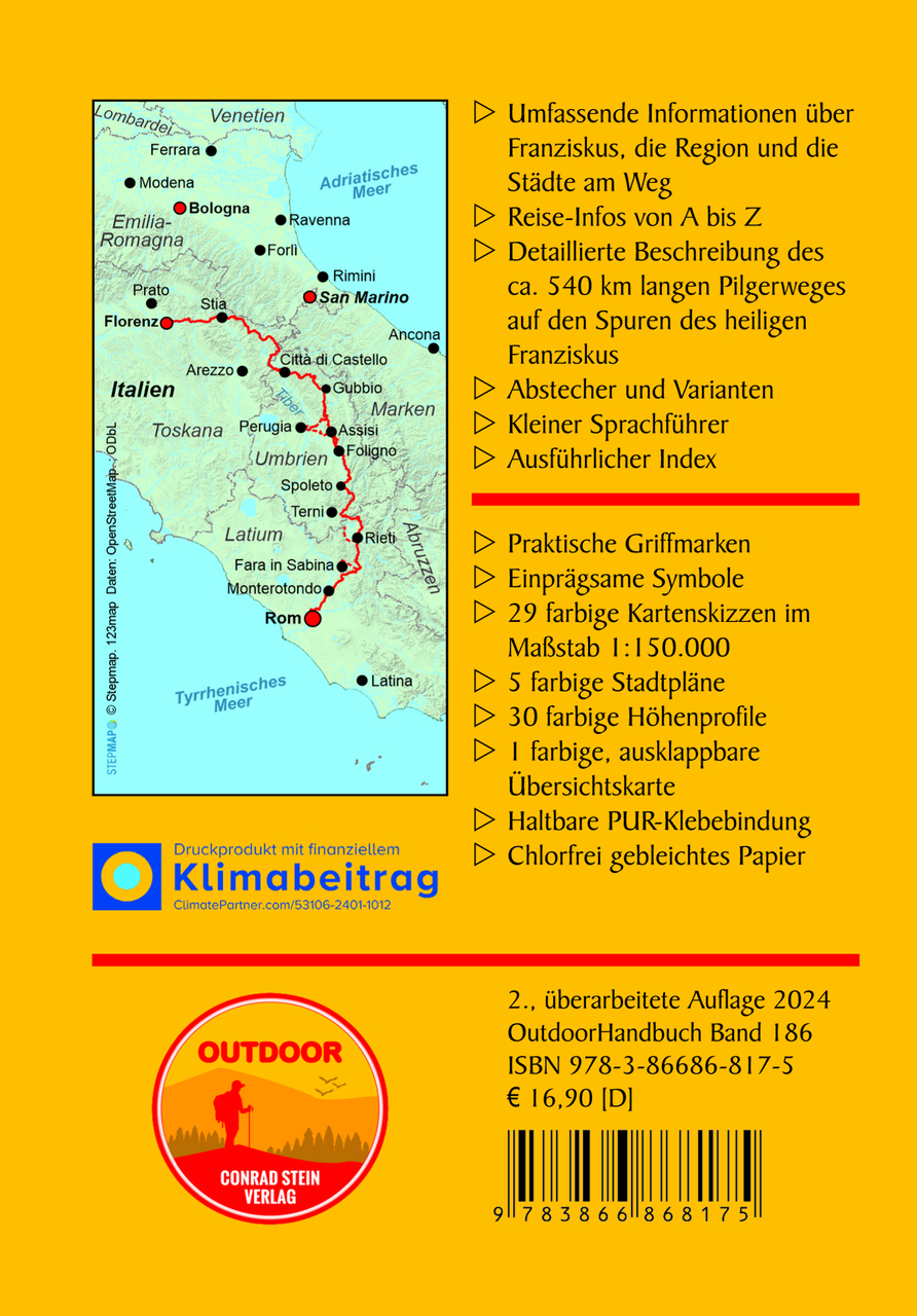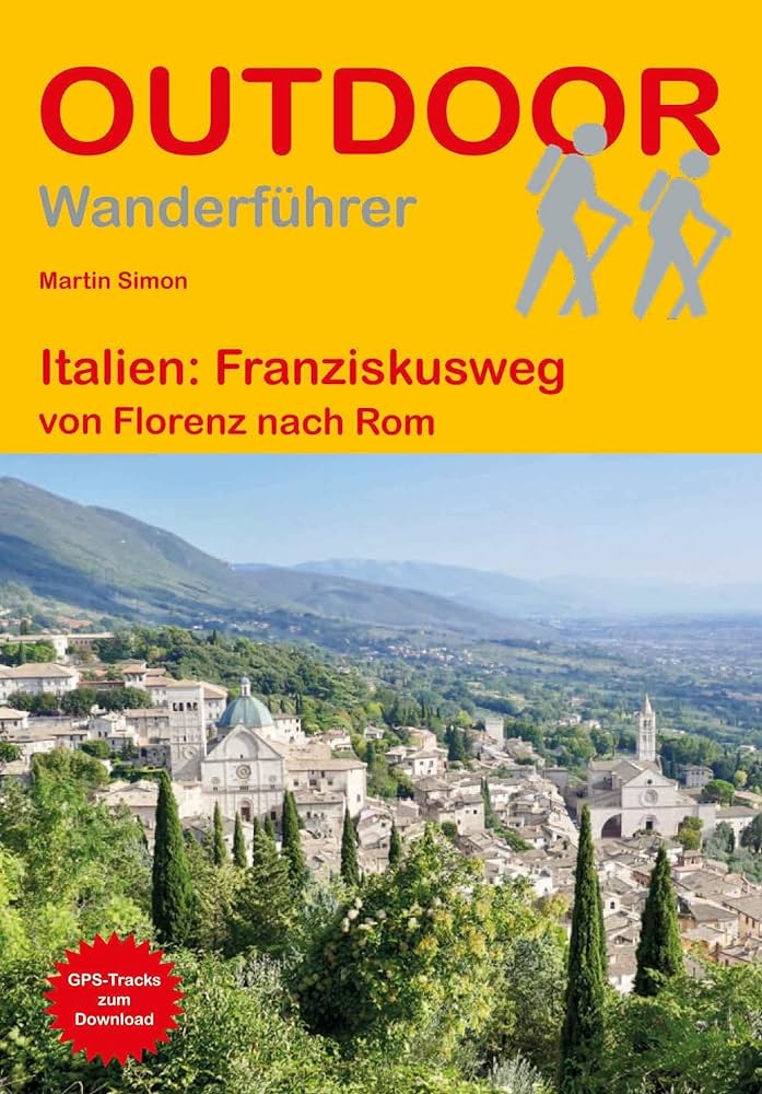 Über 490 km lang ist der Franziskusweg von Florenz über Assisi nach Rom. Die Strecke folgt weitgehend den Höhenzügen des Apennin und führt, wo immer möglich, über einsame Pfade und Wege, die Franziskus vor beinahe 800 Jahren wahrscheinlich benutzt hat. Und vorbei an Plätzen, von denen sicher ist, dass der heilige Fußgänger dort verweilt hat. Es geht durch Täler und über Berge, durch mittelalterliche Städte wie Sansepolcro, Gubbio und Spoleto, und an jahrhundertealten Klöstern vorbei, in denen man häufig sogar übernachten kann. Hier kommt jeder auf seine Kosten: der Pilger auf den Spuren von Franziskus, der Wanderer, der Natur und Ruhe sucht ebenso wie derjenige, der Kunst und Kultur und die italienische Lebensart zu schätzen weiß. Das ganze Wandergebiet ist außerhalb der Städte nicht touristisch; Rucksackwanderer werden noch bestaunt. Der Wanderweg endet in Rom an der Lateranbasilika bei dem großen Franziskus-Monument.