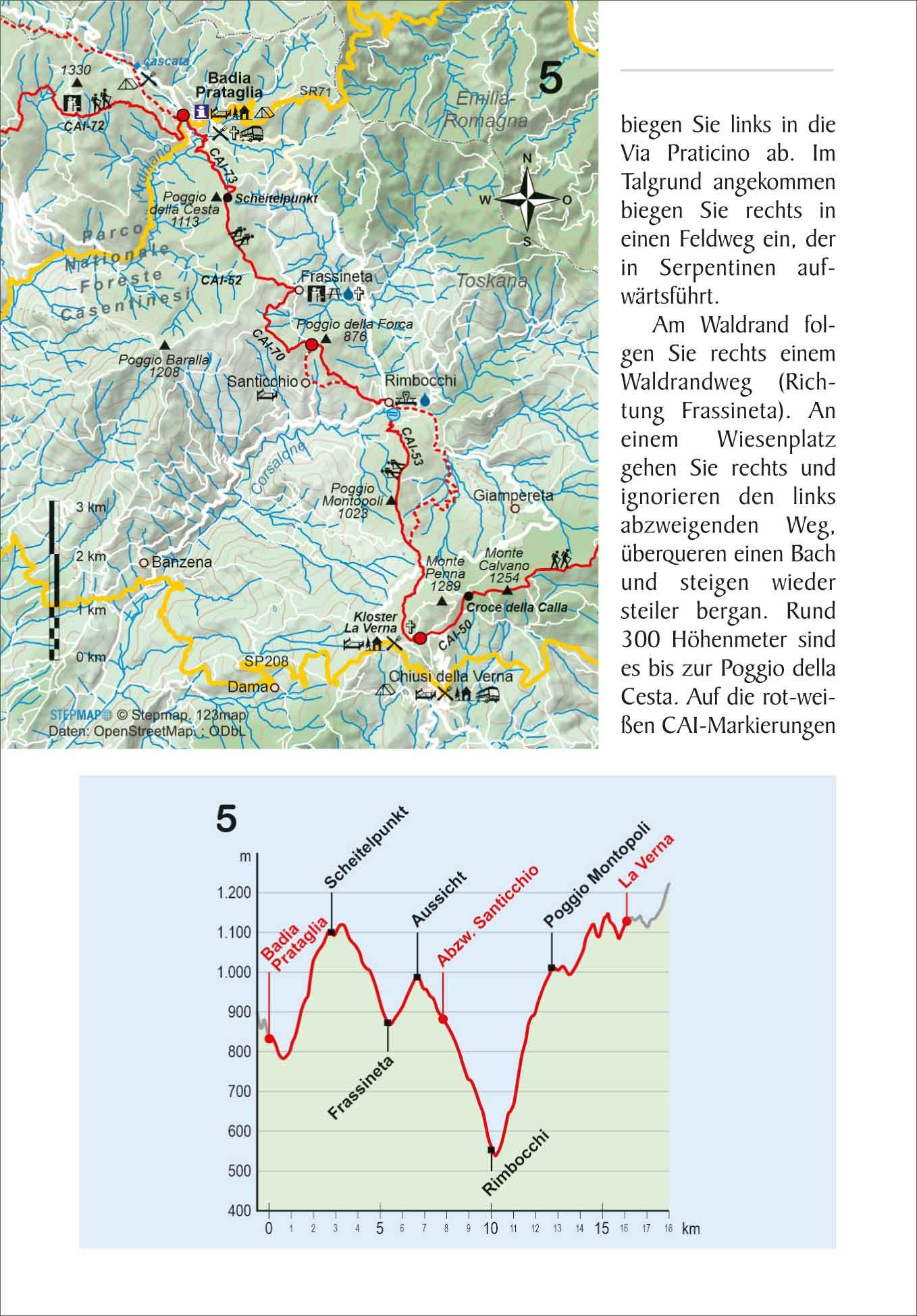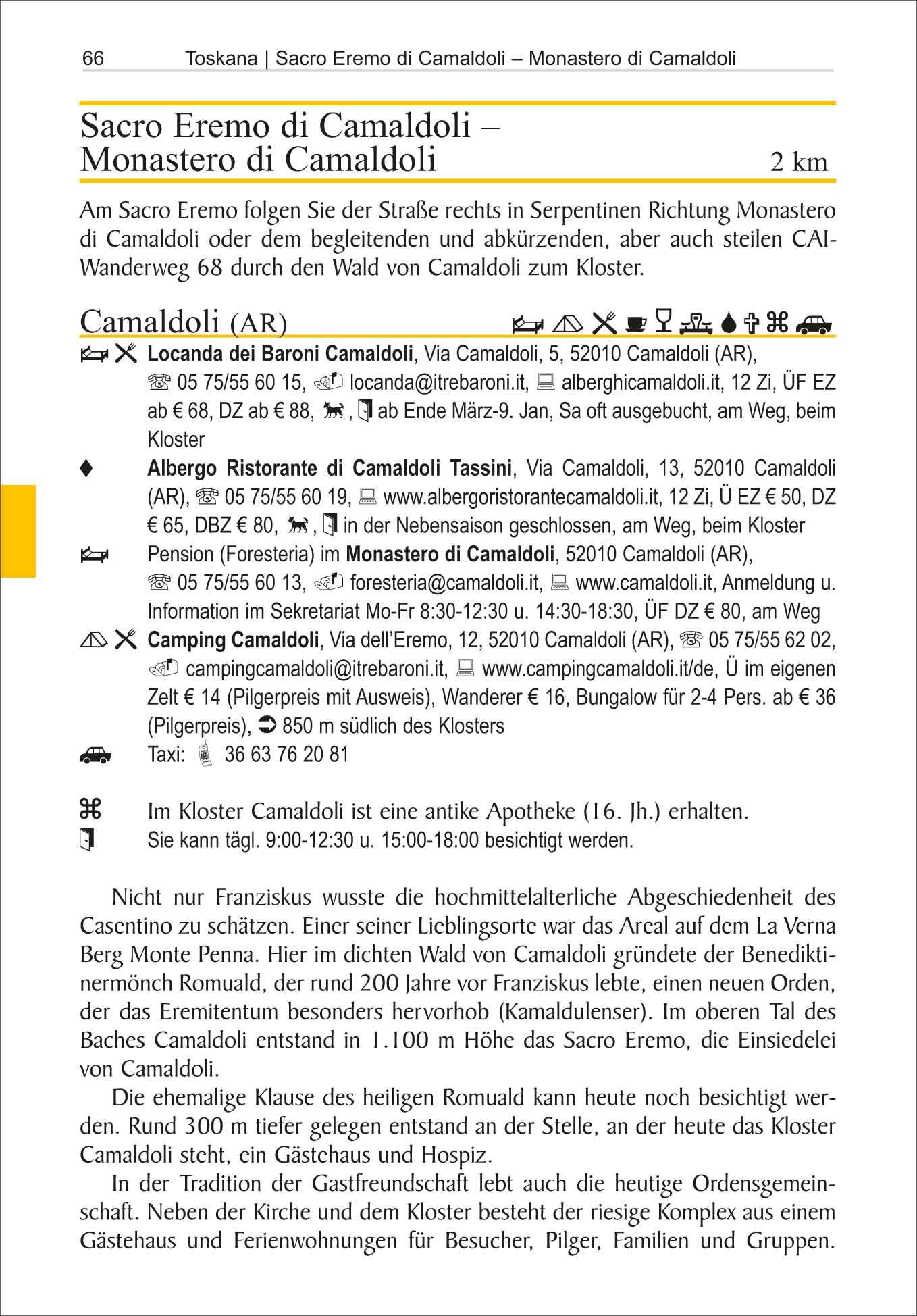 Über 490 km lang ist der Franziskusweg von Florenz über Assisi nach Rom. Die Strecke folgt weitgehend den Höhenzügen des Apennin und führt, wo immer möglich, über einsame Pfade und Wege, die Franziskus vor beinahe 800 Jahren wahrscheinlich benutzt hat. Und vorbei an Plätzen, von denen sicher ist, dass der heilige Fußgänger dort verweilt hat. Es geht durch Täler und über Berge, durch mittelalterliche Städte wie Sansepolcro, Gubbio und Spoleto, und an jahrhundertealten Klöstern vorbei, in denen man häufig sogar übernachten kann. Hier kommt jeder auf seine Kosten: der Pilger auf den Spuren von Franziskus, der Wanderer, der Natur und Ruhe sucht ebenso wie derjenige, der Kunst und Kultur und die italienische Lebensart zu schätzen weiß. Das ganze Wandergebiet ist außerhalb der Städte nicht touristisch; Rucksackwanderer werden noch bestaunt. Der Wanderweg endet in Rom an der Lateranbasilika bei dem großen Franziskus-Monument.