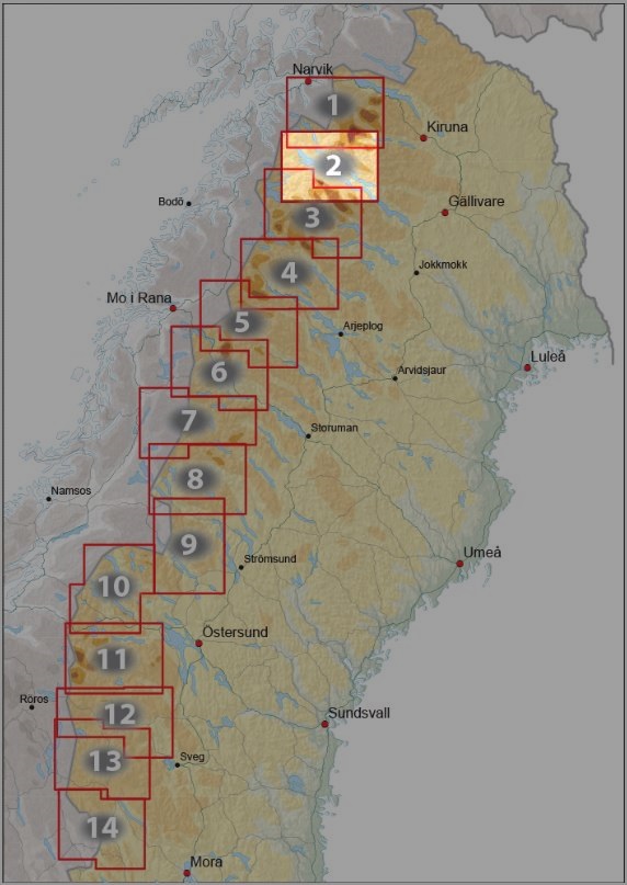 Op schaal 1:75 000, bedekken de kaarten uit deze serie de volledige Zweedse bergketen, van Treriksröset in het noorden tot Sälen in het zuiden, alsook enkele stukken van de Noorse bergen. Gedetailleerd als ze zijn, zijn dit voor wandelaars de meest geschikte kaarten. Bovendien zijn ze scheur- en watervast. Specifieke berginformatie wordt weergegeven, waaronder: gemarkeerde zomer- en winterpaden, routes geschikt voor sneeuwscooters, bruggen en doorwaadbare plaatsen, (uitgeruste) berghutten, noodnummers enz. Op kaartbladen 1-6 is de Kungsleden wandelroute speciaal aangeduid, alsook de afstanden en geschatte wandeltijden voor de verschillende etappes.