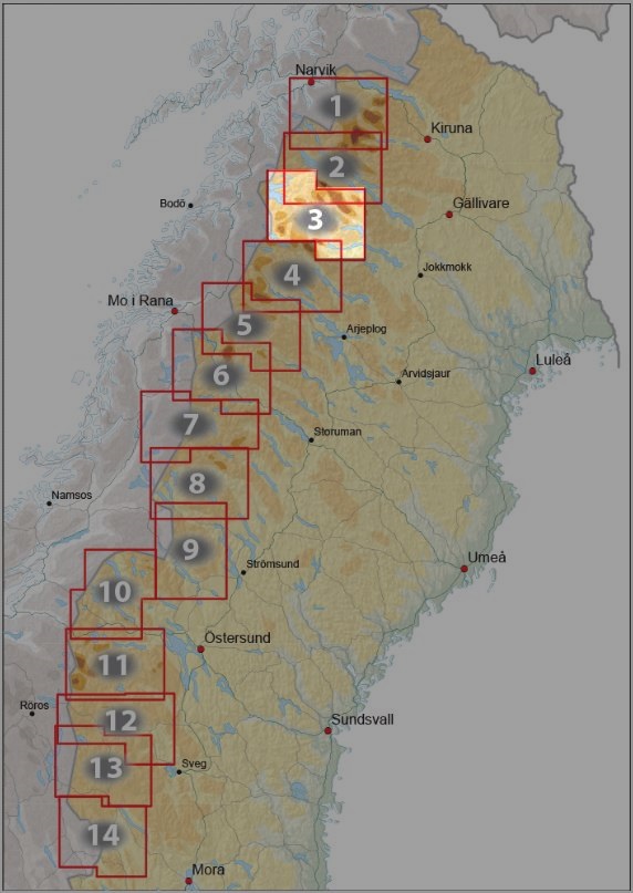 Op schaal 1:75 000, bedekken de kaarten uit deze serie de volledige Zweedse bergketen, van Treriksröset in het noorden tot Sälen in het zuiden, alsook enkele stukken van de Noorse bergen. Gedetailleerd als ze zijn, zijn dit voor wandelaars de meest geschikte kaarten. Bovendien zijn ze scheur- en watervast. Specifieke berginformatie wordt weergegeven, waaronder: gemarkeerde zomer- en winterpaden, routes geschikt voor sneeuwscooters, bruggen en doorwaadbare plaatsen, (uitgeruste) berghutten, noodnummers enz. Op kaartbladen 1-6 is de Kungsleden wandelroute speciaal aangeduid, alsook de afstanden en geschatte wandeltijden voor de verschillende etappes.