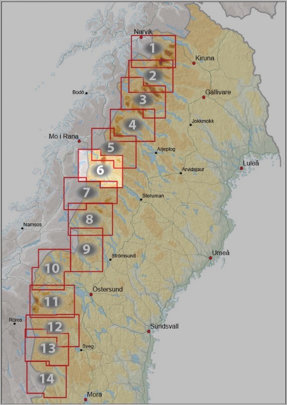 Op schaal 1:75 000, bedekken de kaarten uit deze serie de volledige Zweedse bergketen, van Treriksröset in het noorden tot Sälen in het zuiden, alsook enkele stukken van de Noorse bergen. Gedetailleerd als ze zijn, zijn dit voor wandelaars de meest geschikte kaarten. Bovendien zijn ze scheur- en watervast. Specifieke berginformatie wordt weergegeven, waaronder: gemarkeerde zomer- en winterpaden, routes geschikt voor sneeuwscooters, bruggen en doorwaadbare plaatsen, (uitgeruste) berghutten, noodnummers enz. Op kaartbladen 1-6 is de Kungsleden wandelroute speciaal aangeduid, alsook de afstanden en geschatte wandeltijden voor de verschillende etappes.